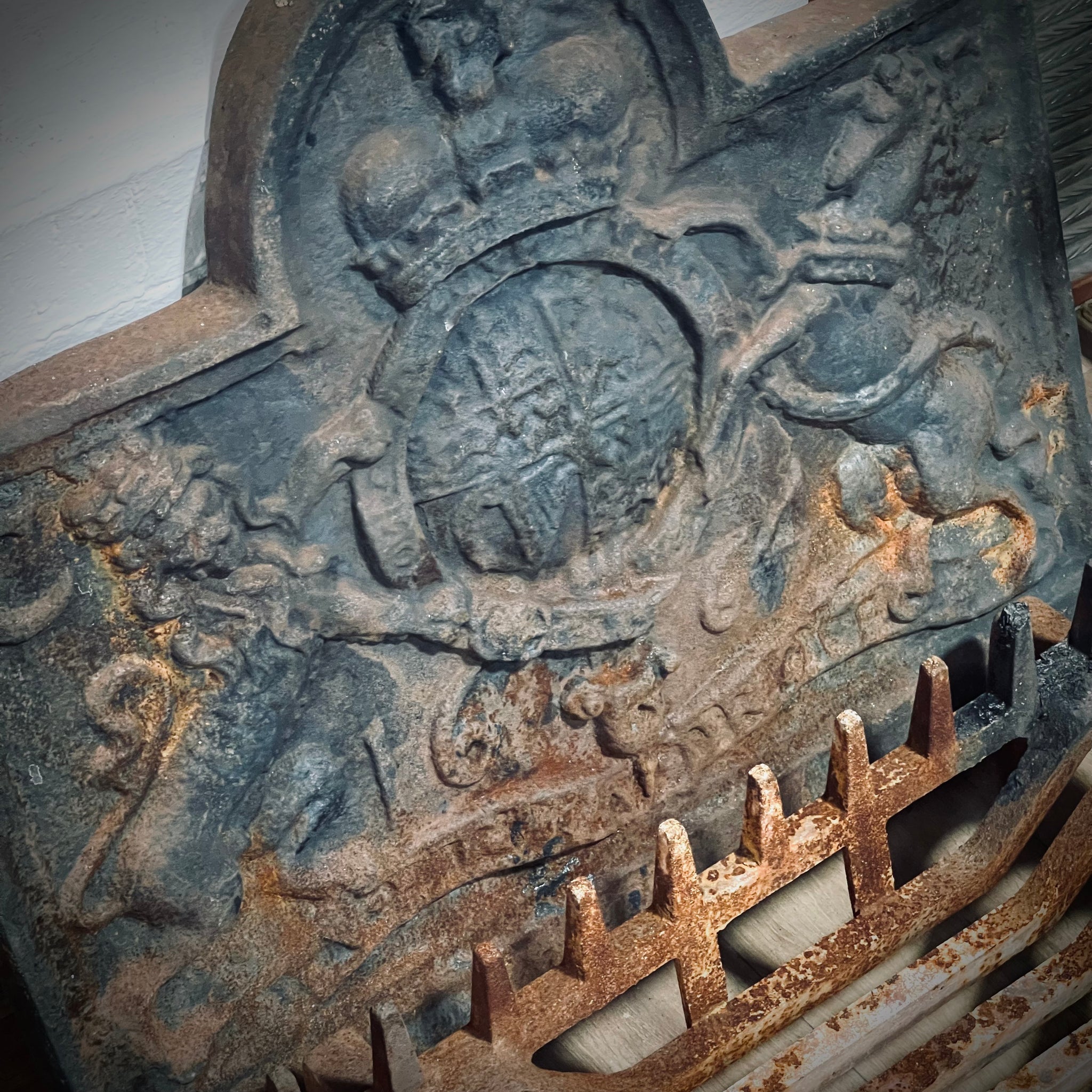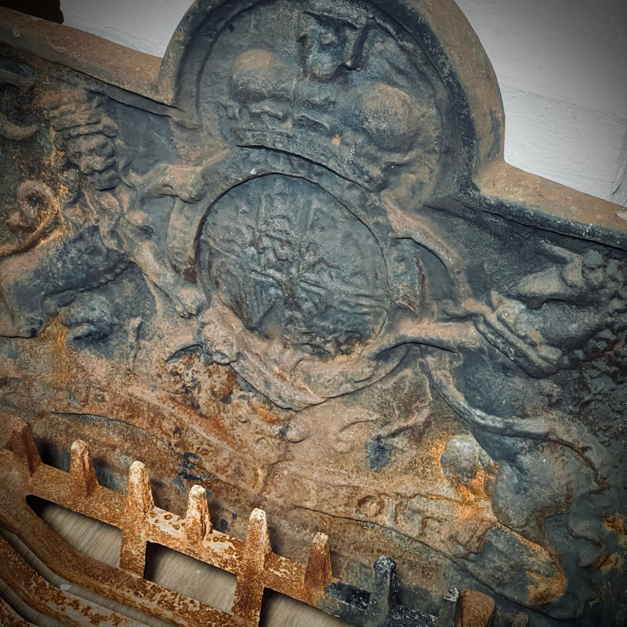 A striking cast iron fireplace ensemble comprising a decorative fire back, basket, and dogs. The fire back is dated 1664 and displays the Royal Coat of Arms in bold relief, flanked by the lion and unicorn supporters. The basket and dogs are crafted with robust architectural forms, topped with turned finials. Together, they form an evocative and practical set, full of historic presence and patina from centuries of use. A distinctive focal point for a period fireplace, combining durability with timeless design.