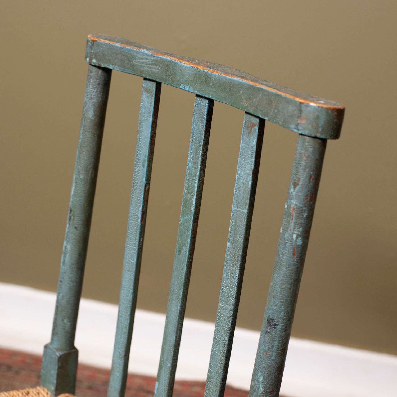 - Condition notes: General wear throughout. Paint losses, scuffs and surface marks consistent with age. Rush seat intact with minor fraying at edges. Structurally sound.
