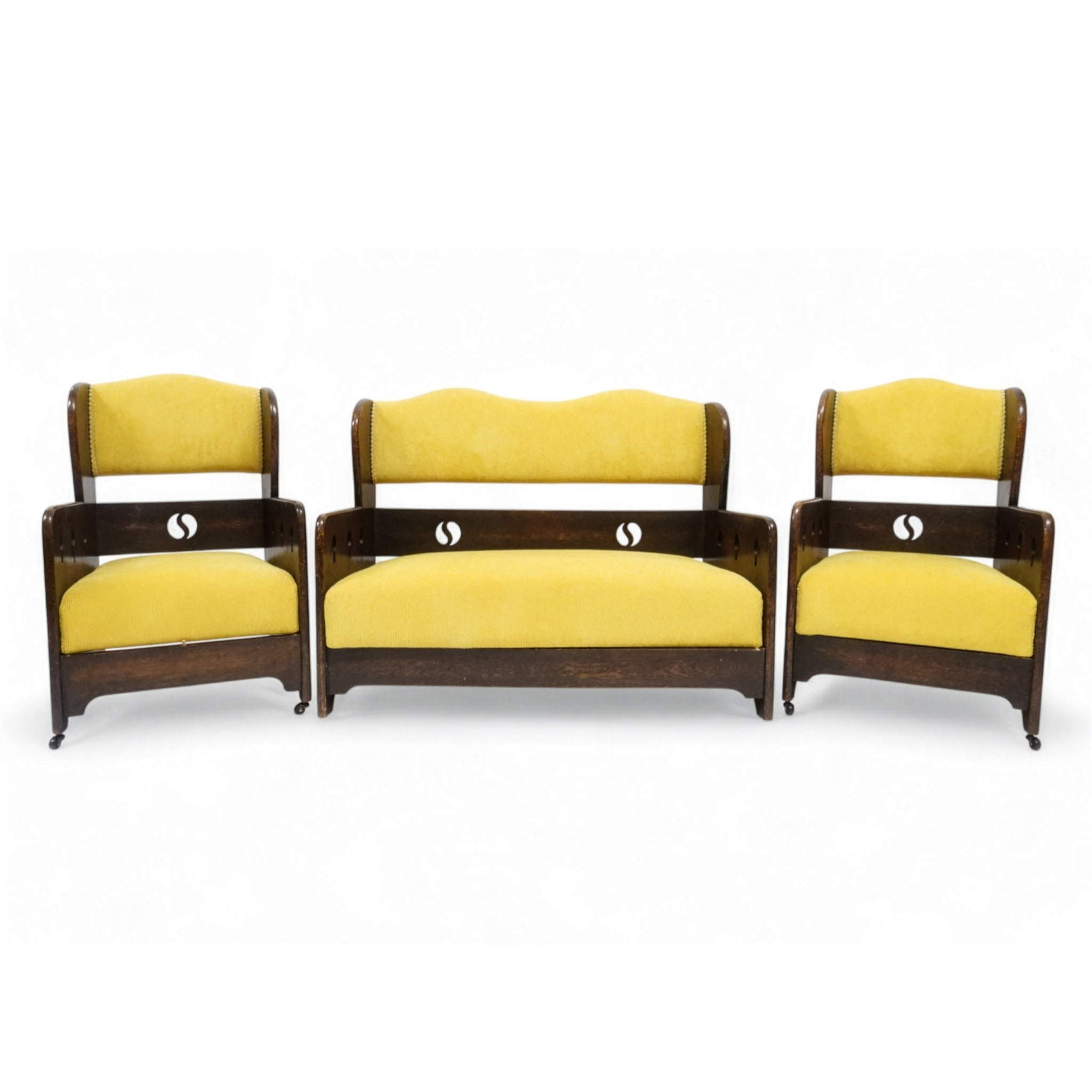 A rare and well-proportioned Arts & Crafts three-piece suite, comprising a two-seater settee and a matching pair of armchairs, executed in oak and upholstered in yellow corduroy.