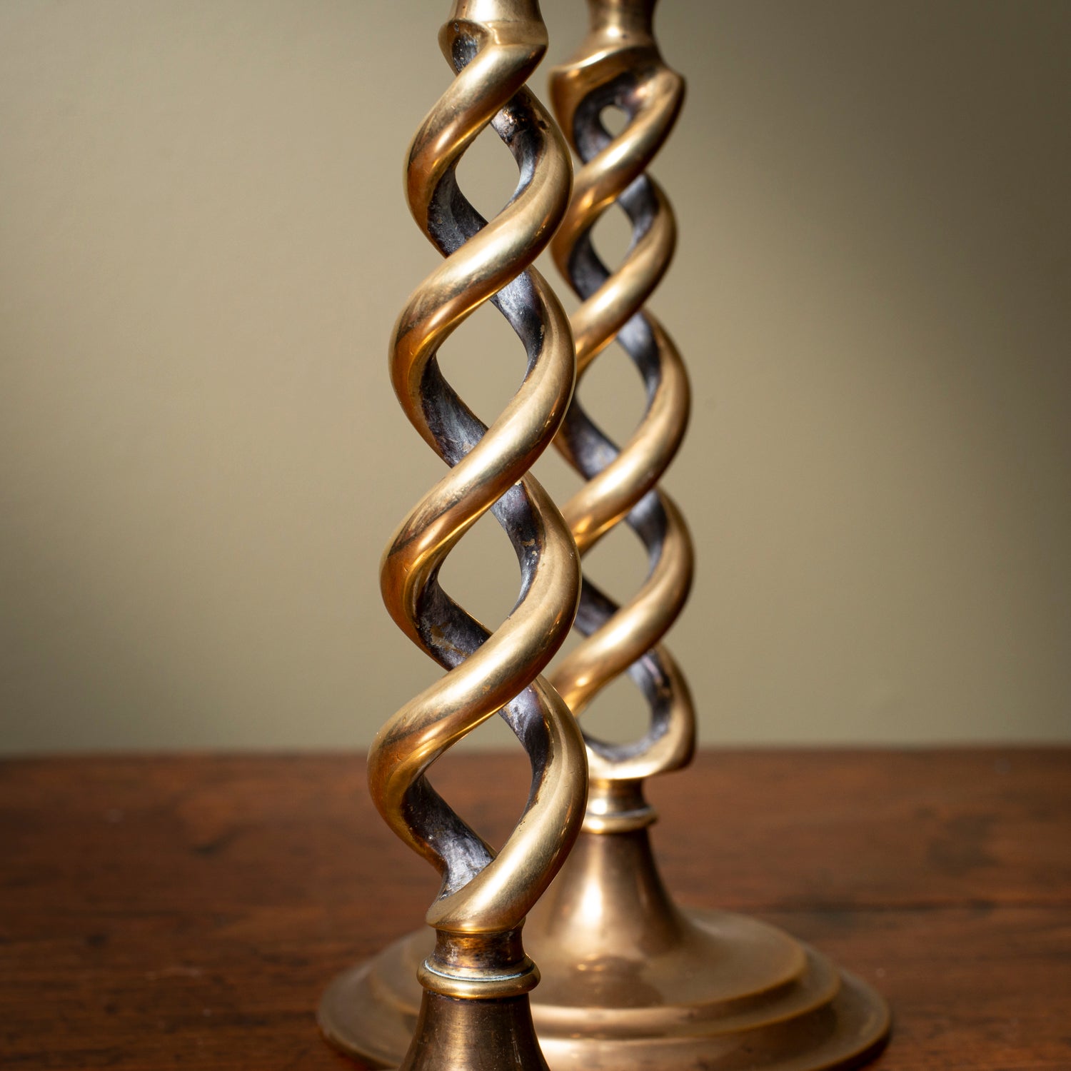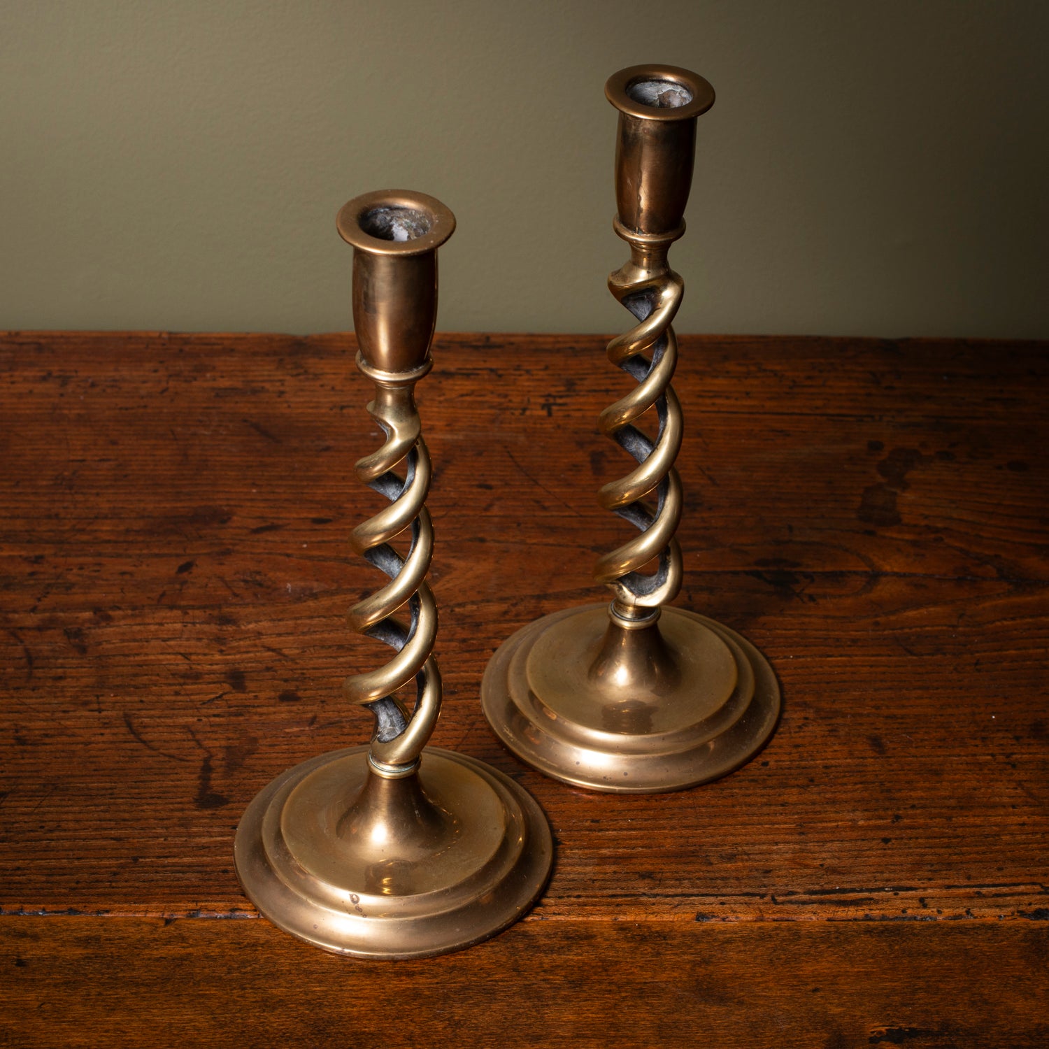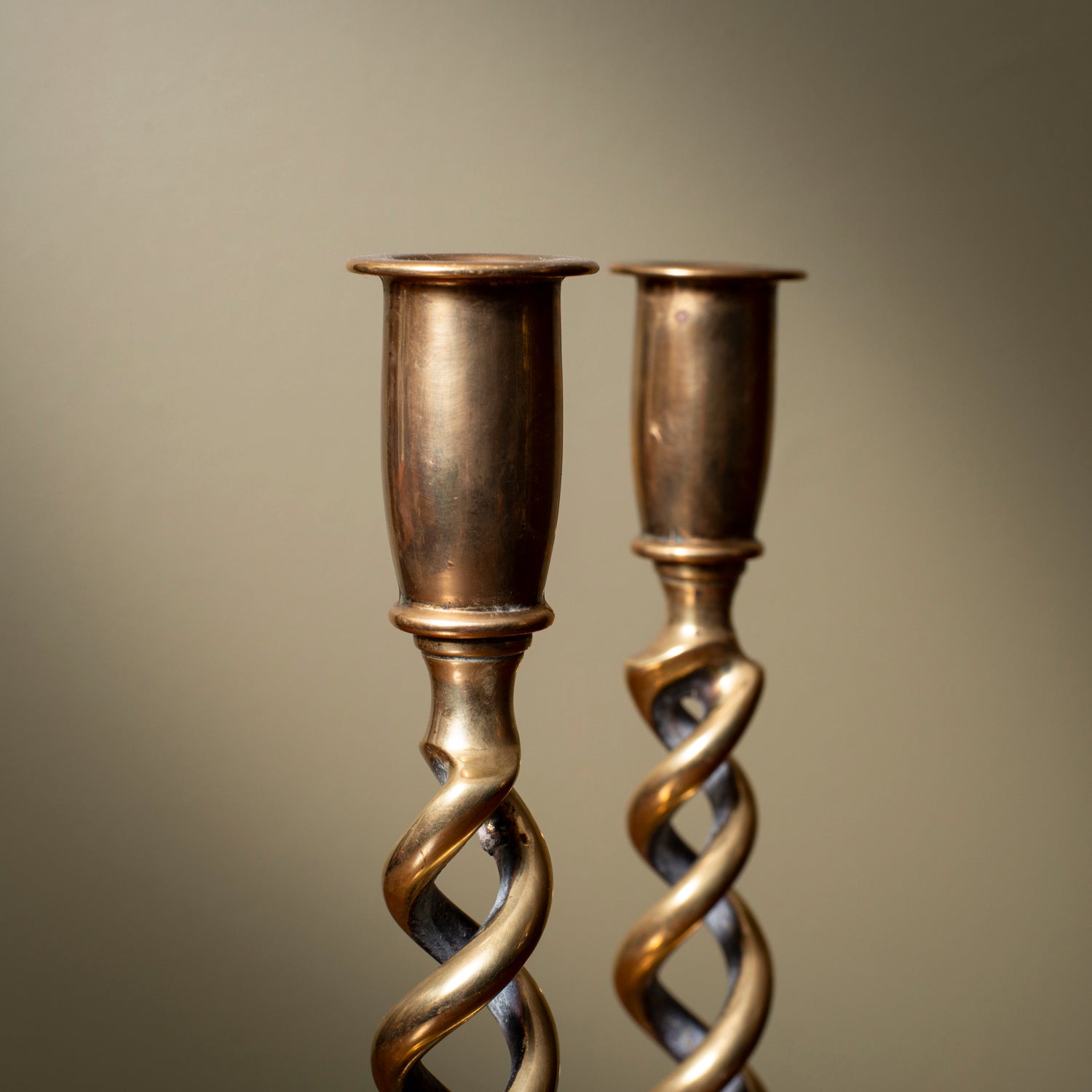 A charming pair of vintage brass candlesticks with a classic barley twist design. The solid brass has developed a soft, natural patina over time, giving these candlesticks a mellow, lived-in warmth. Timeless in form and sturdy in build, they're just the thing to add character to a quiet corner or a touch of candlelit atmosphere to the dinner table. Sold as a pair.