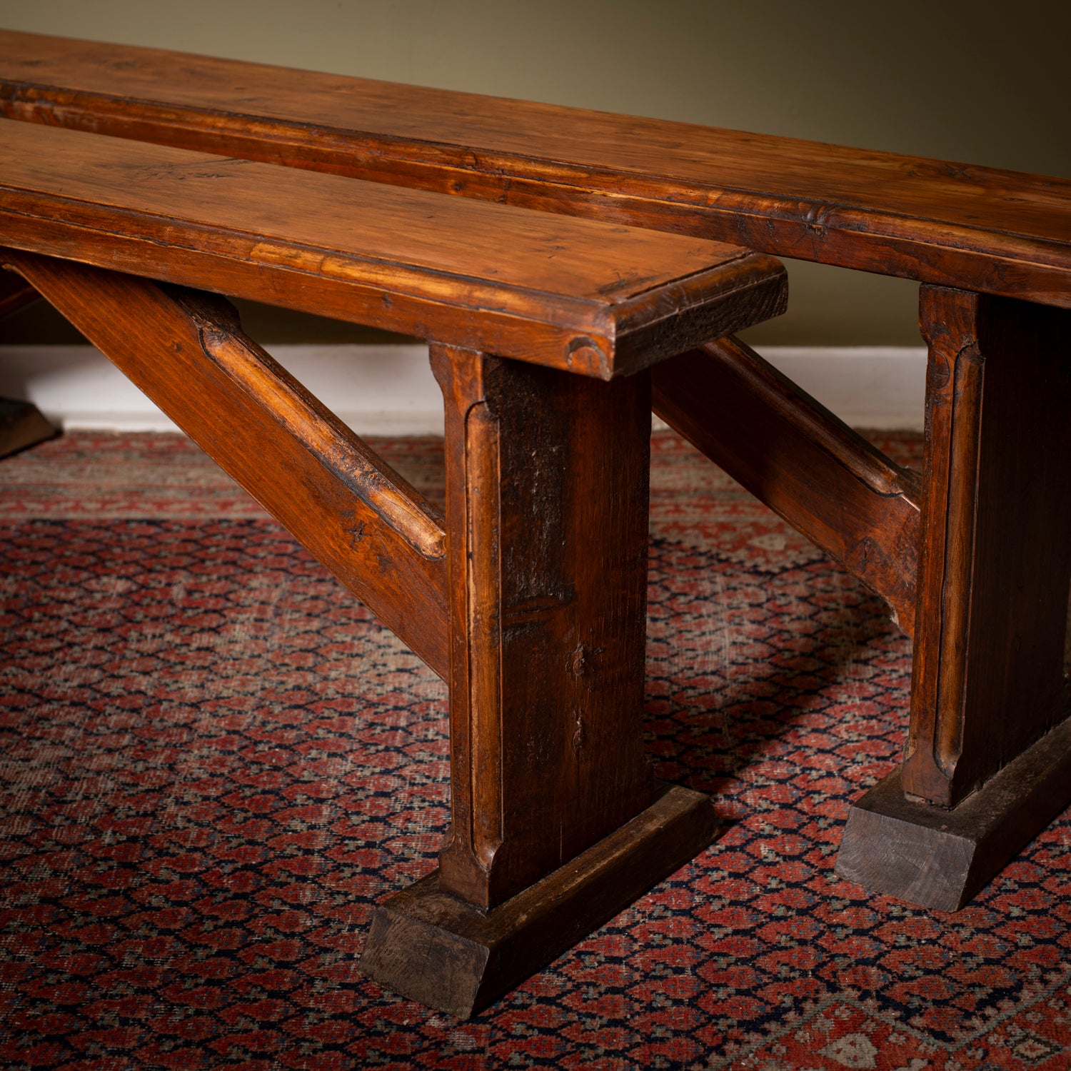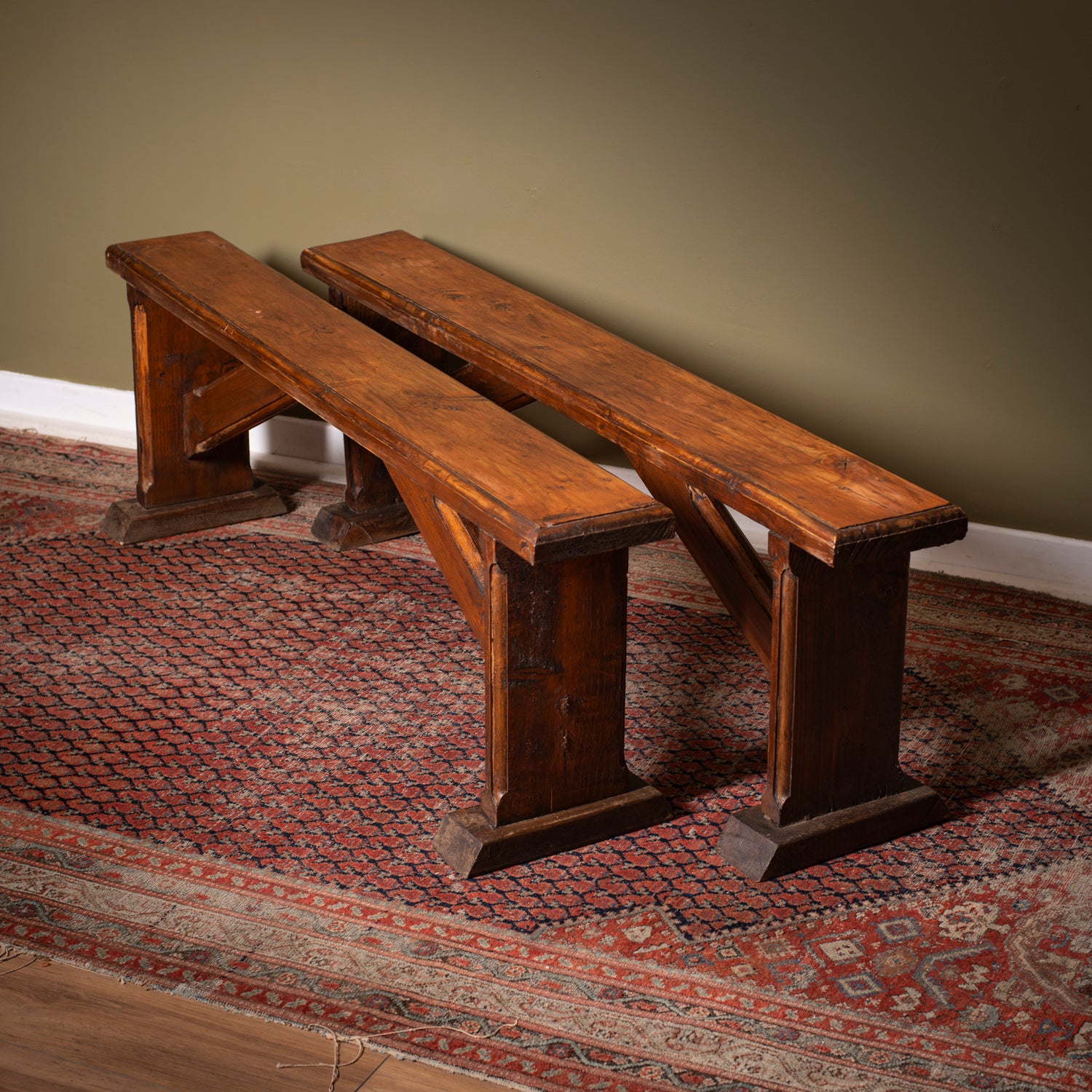 A matched pair of late 19th to early 20th century chapel benches with excellent colour and honest wear. Solid and heavy with pegged construction, chamfered edges and shaped end supports. Originally made for church or chapel use, now ideal for a hallway, kitchen, dining space or retail display. Simple, functional and full of character. £165 per bench.