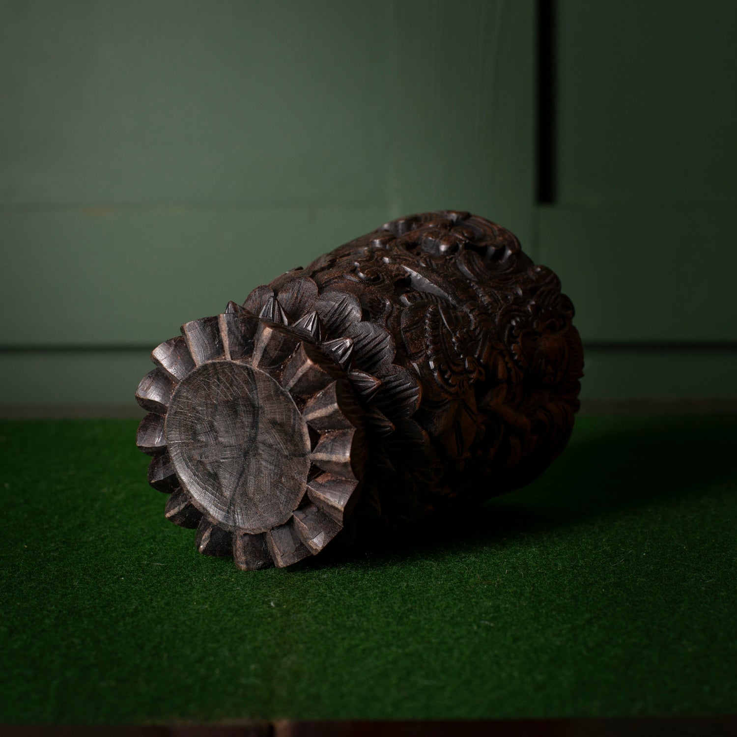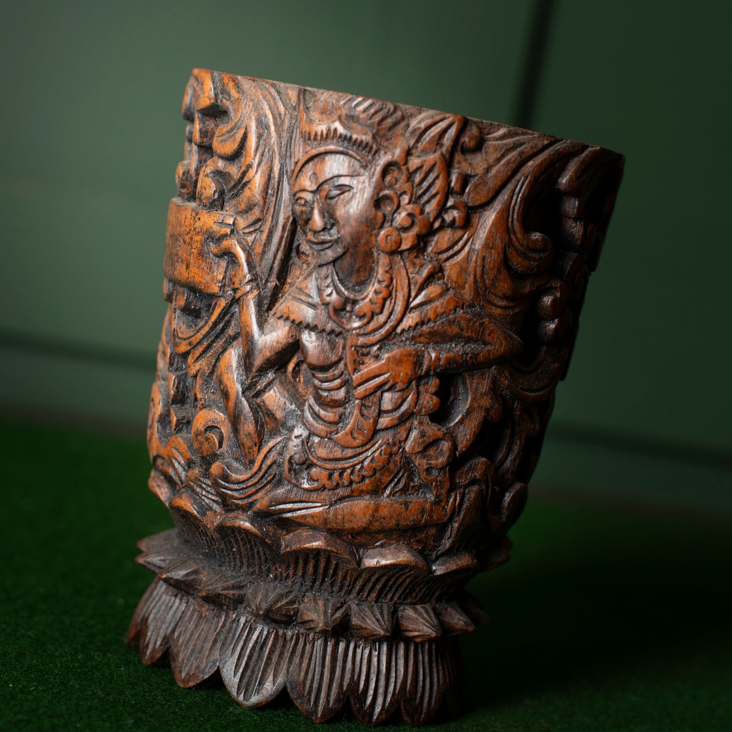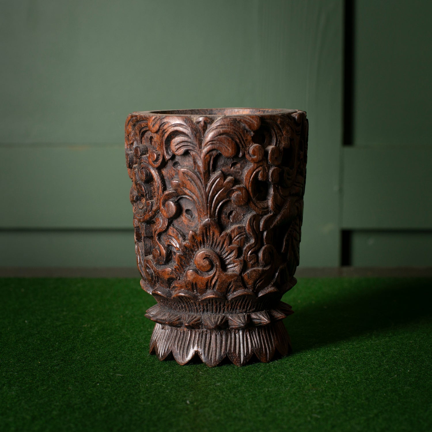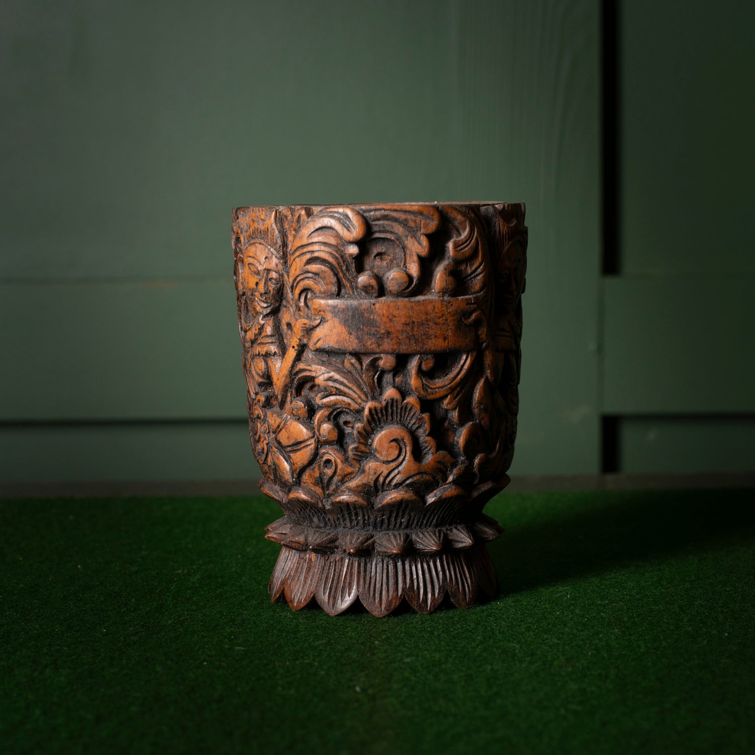 A carved Chinese brush pot featuring detailed relief work with figures, foliage, and traditional decorative motifs. The piece is carved from a single section of wood and stands on an integrated, flared base with petal-style carving. Surface wear is consistent with age and handling. A solid example of traditional Chinese woodcarving suitable for display or use as a brush holder.