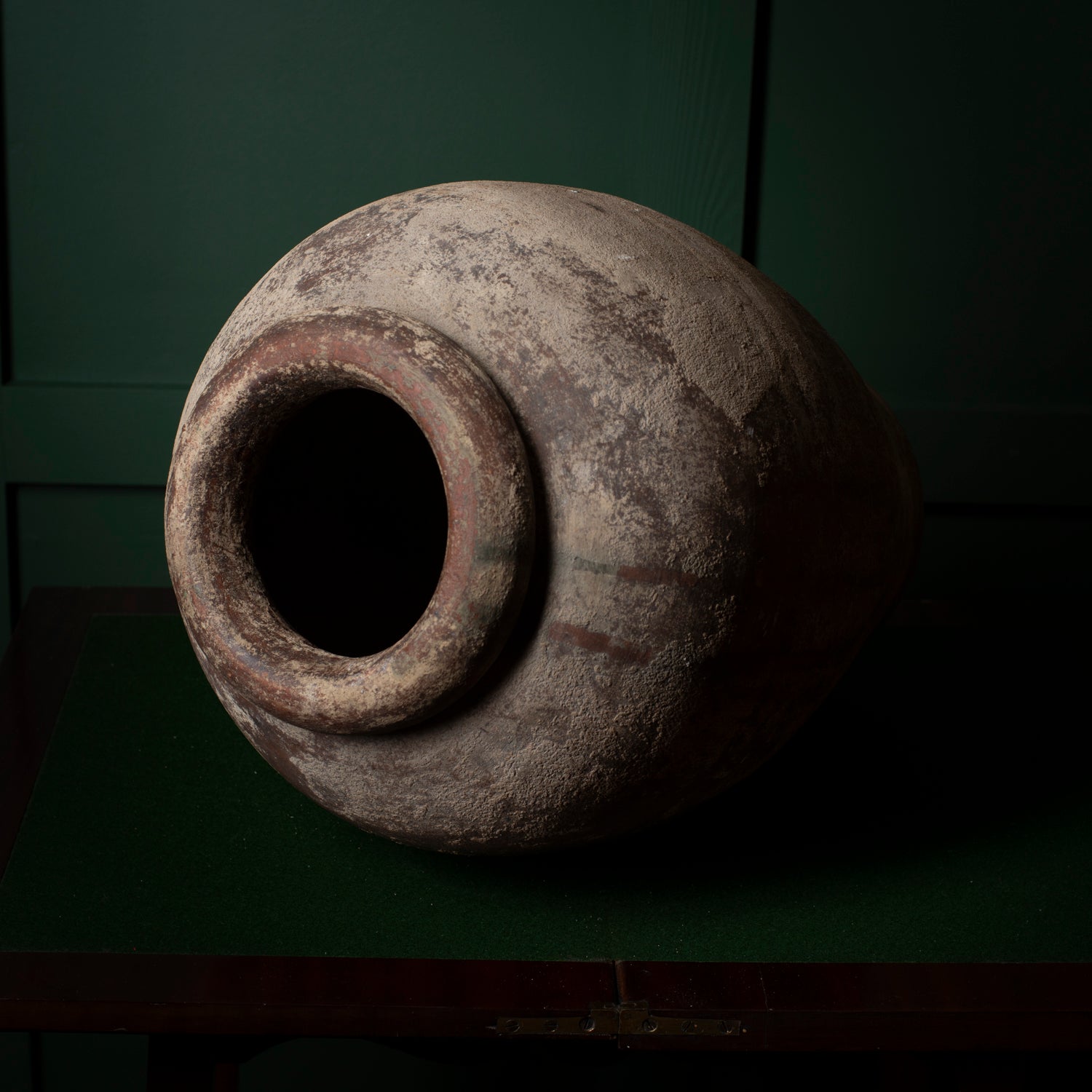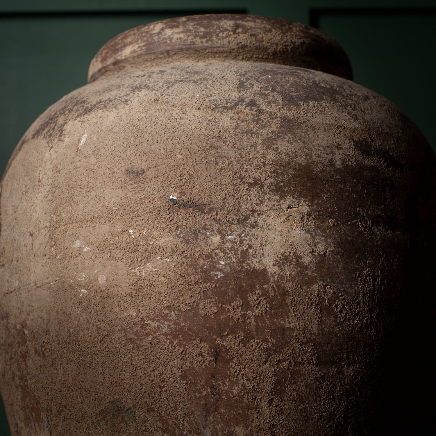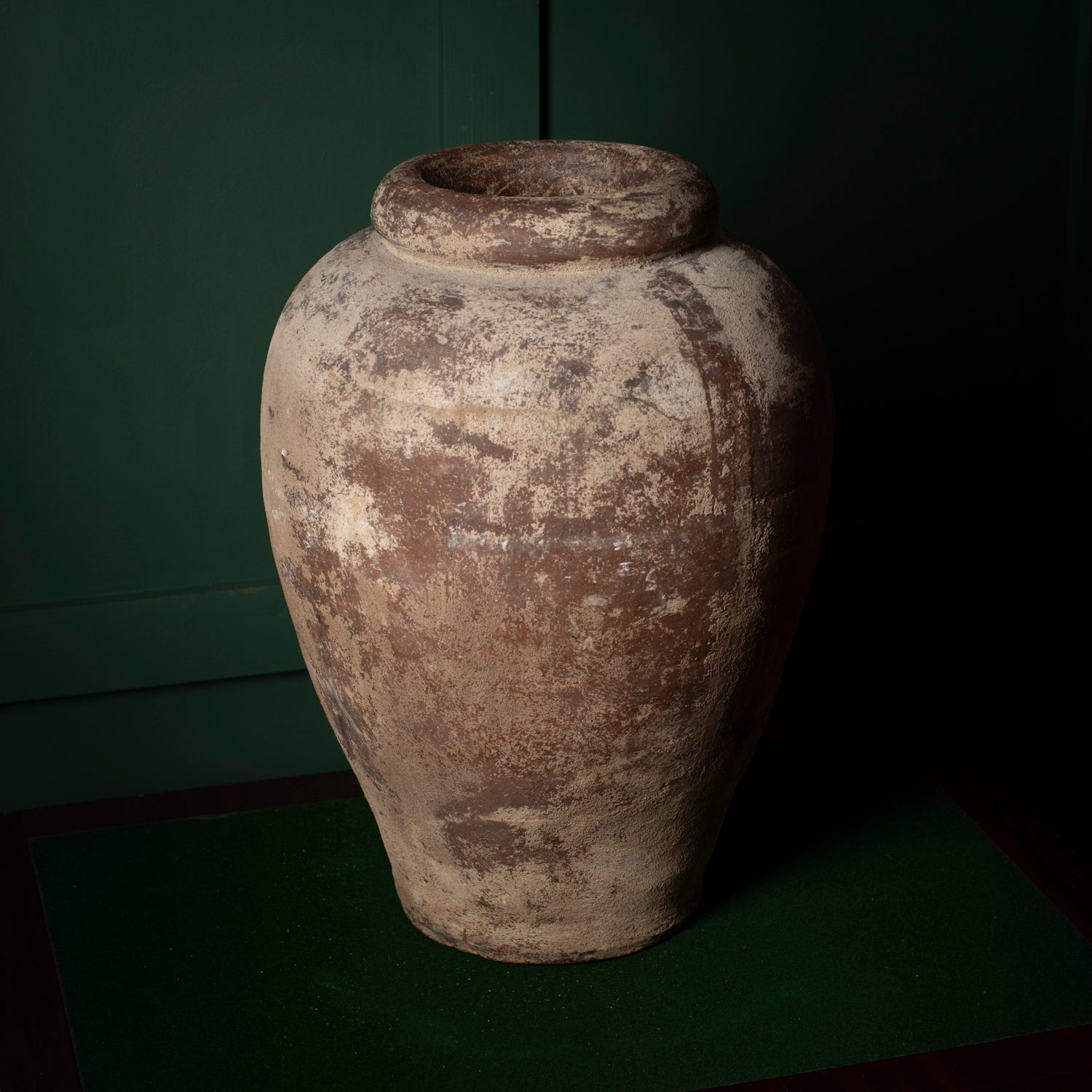 A substantial antique clay vessel with a classic ovoid form and thick rolled rim. Hand-thrown in coarse earthenware, the surface shows heavy natural wear, mineral deposits, firing marks and surface losses developed through long use and age. The muted tones and uneven texture give the piece strong sculptural presence.