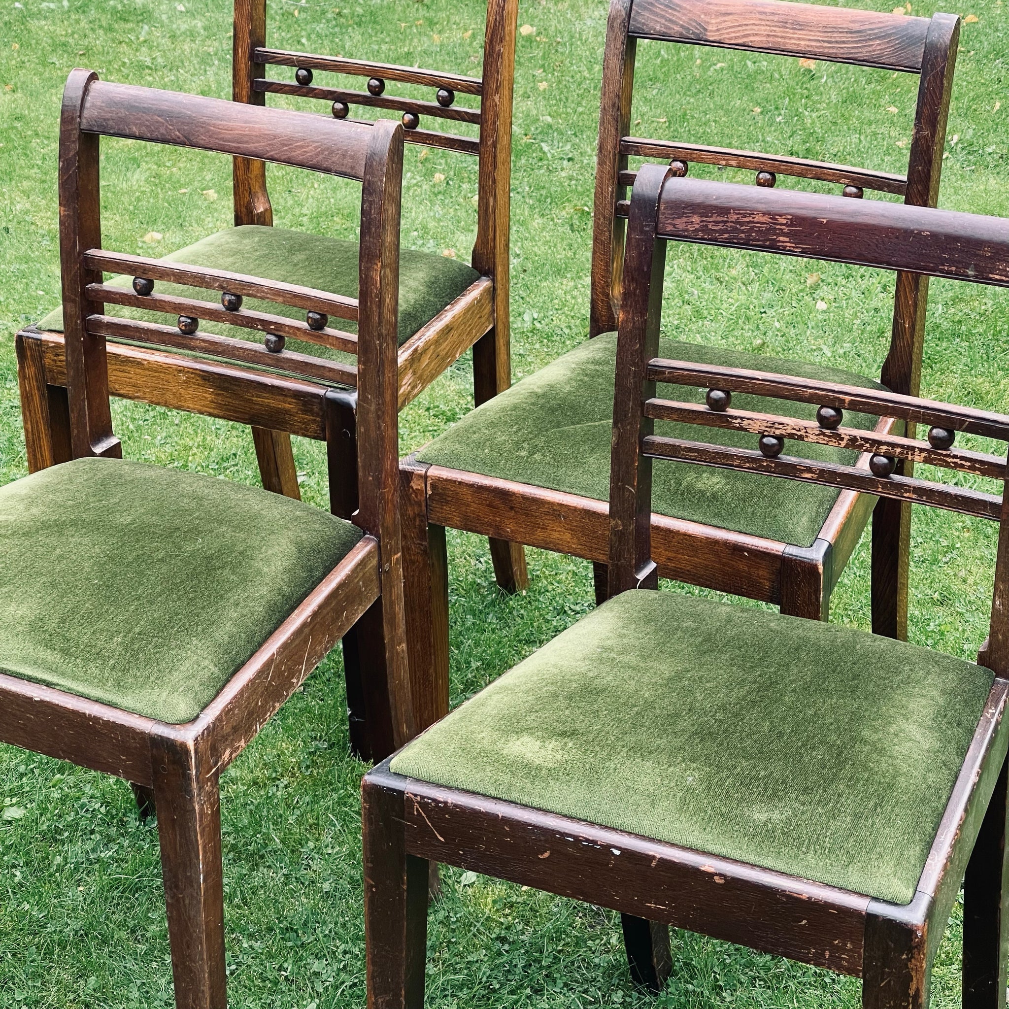 Condition Notes: All four chairs are sturdy and usable. The wood shows some wear and scratches, and the velvet has aged but remains intact.