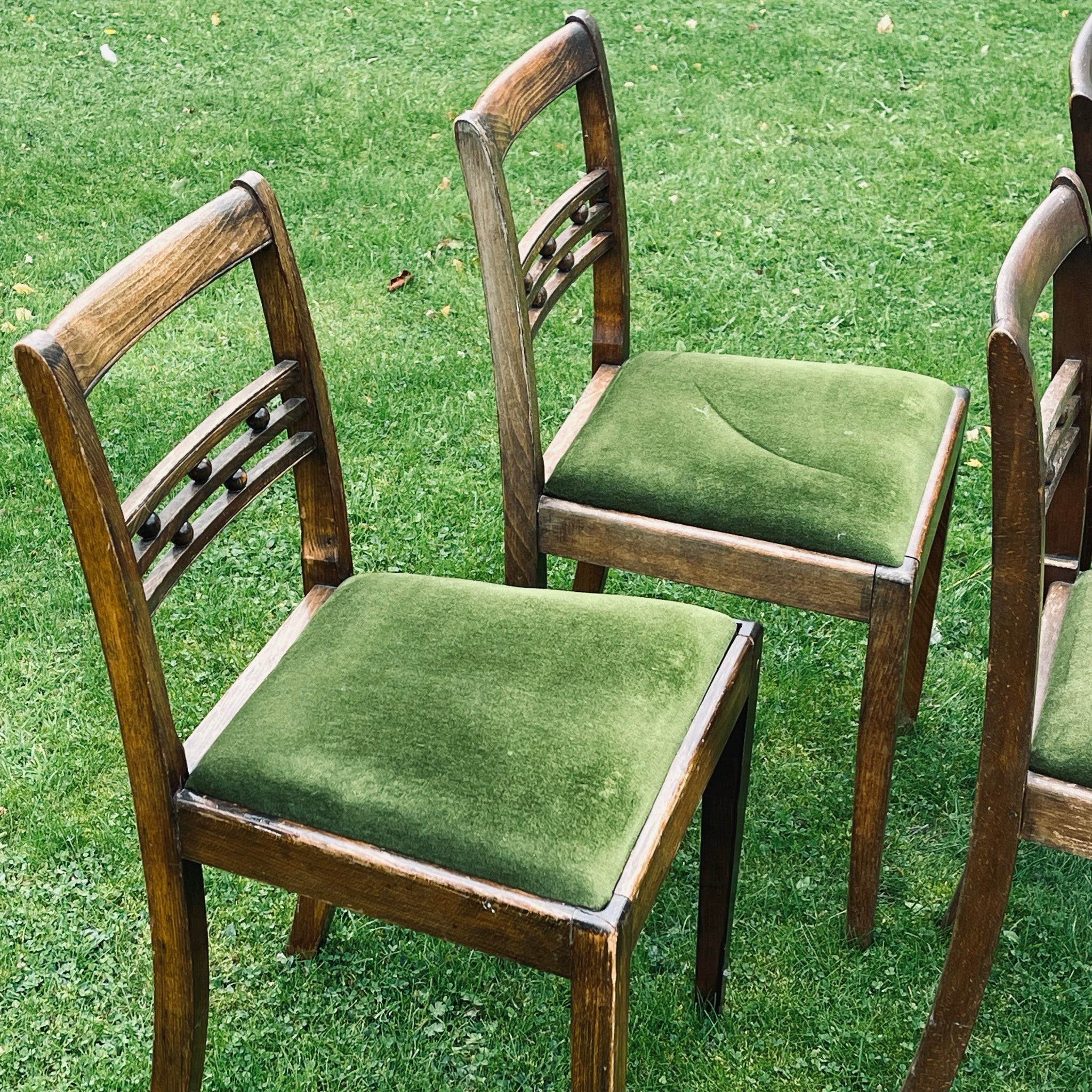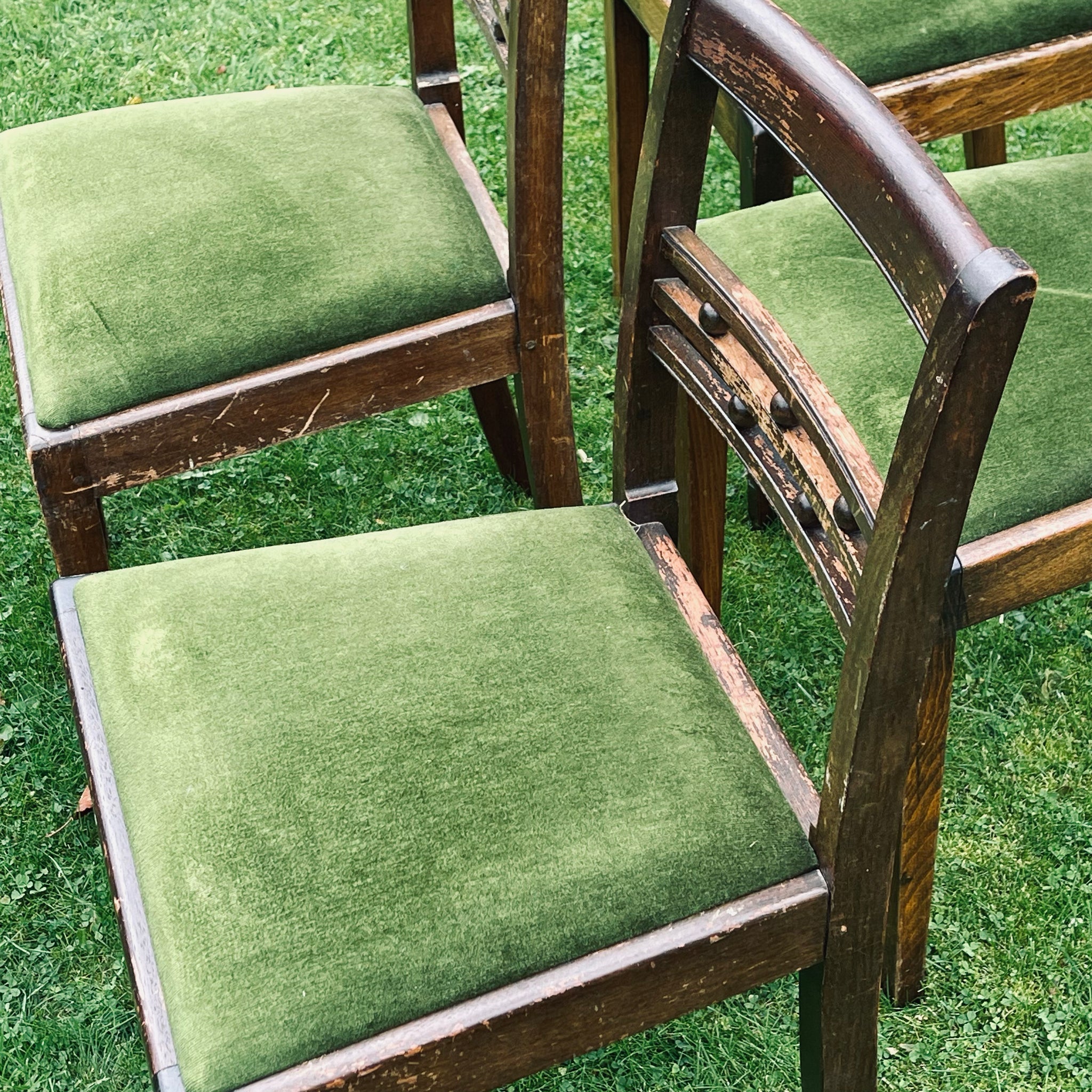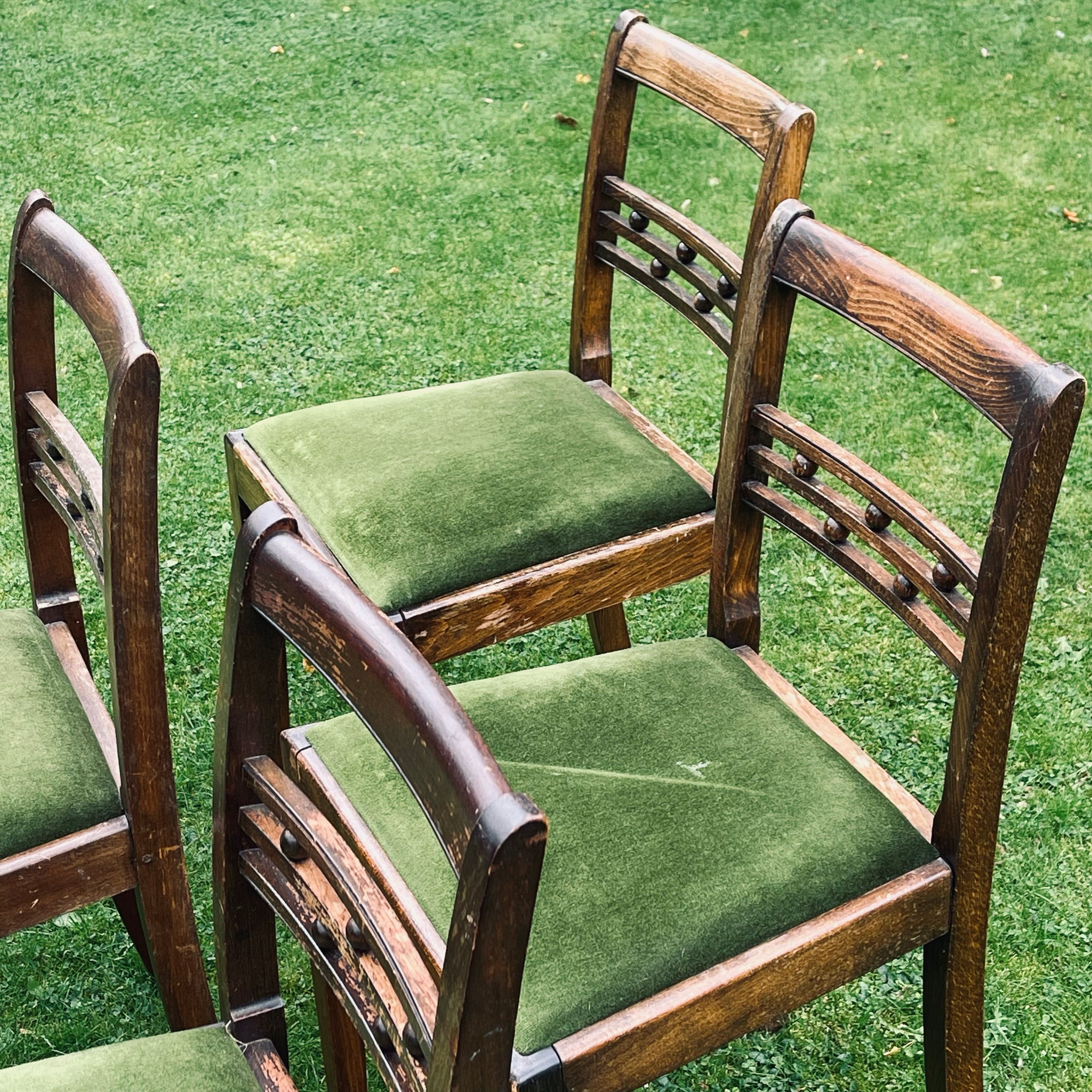 The frames are sturdy and well-crafted, with simple slatted backs decorated with wooden pegs. The seats are upholstered in the original green velvet, which has worn gently with age. A good, honest set of British-made chairs with plenty of character and history.