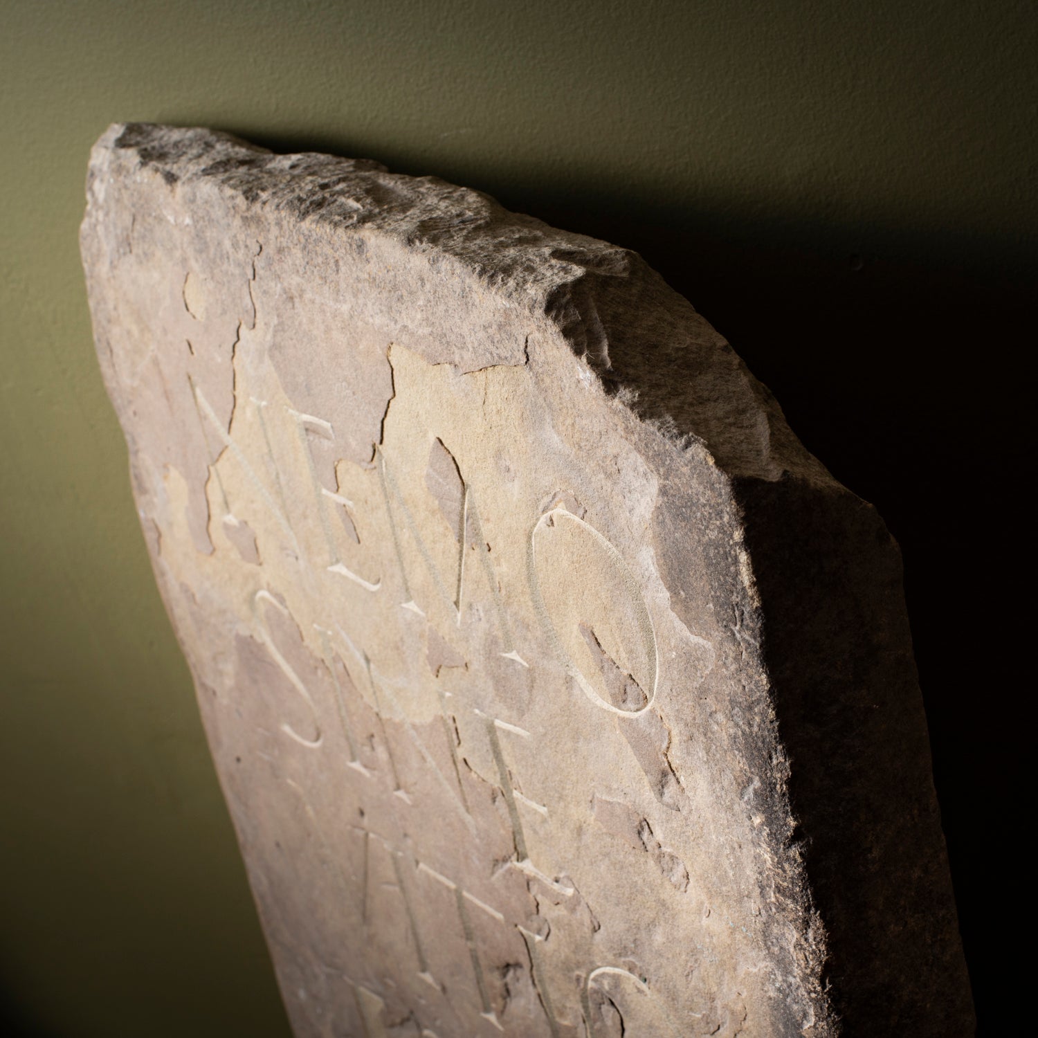Provenance/Story: Original stone sourced in Scotland; reinterpreted by artisan Cameron Wallace with a hand-cut Latin inscription.