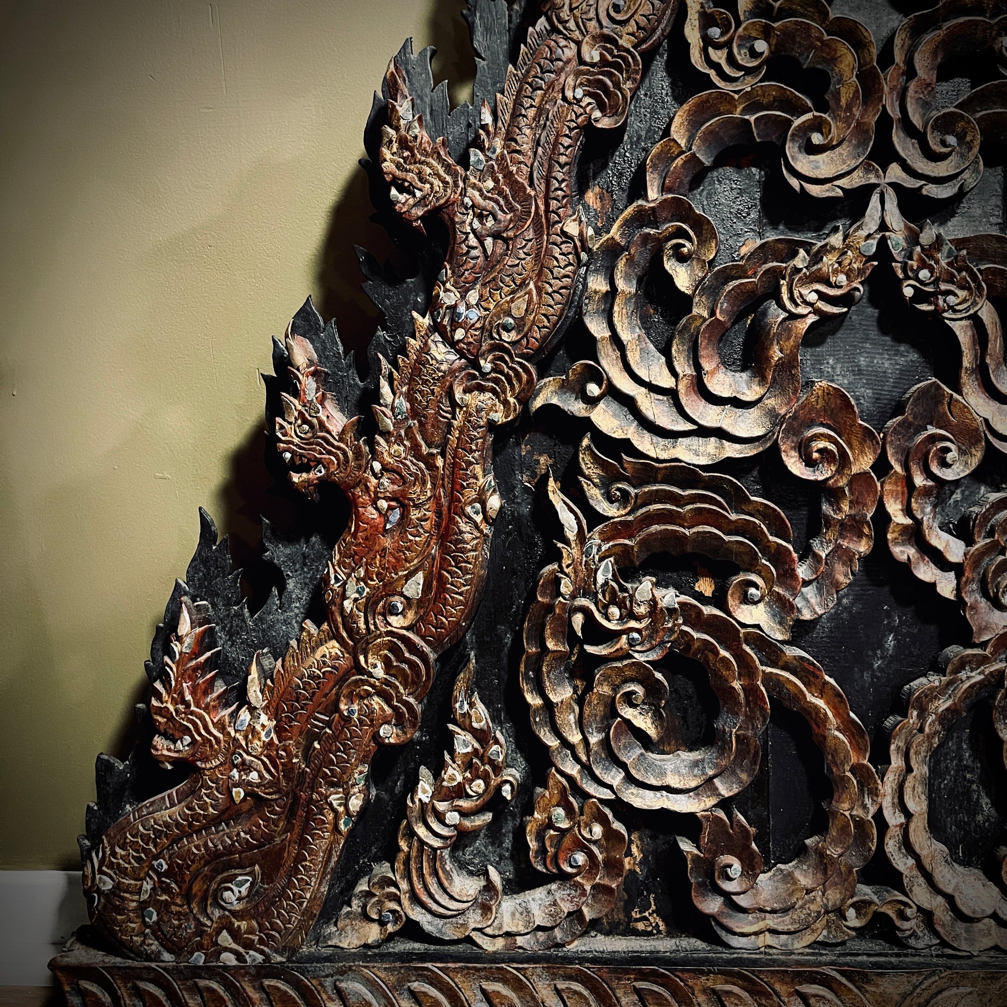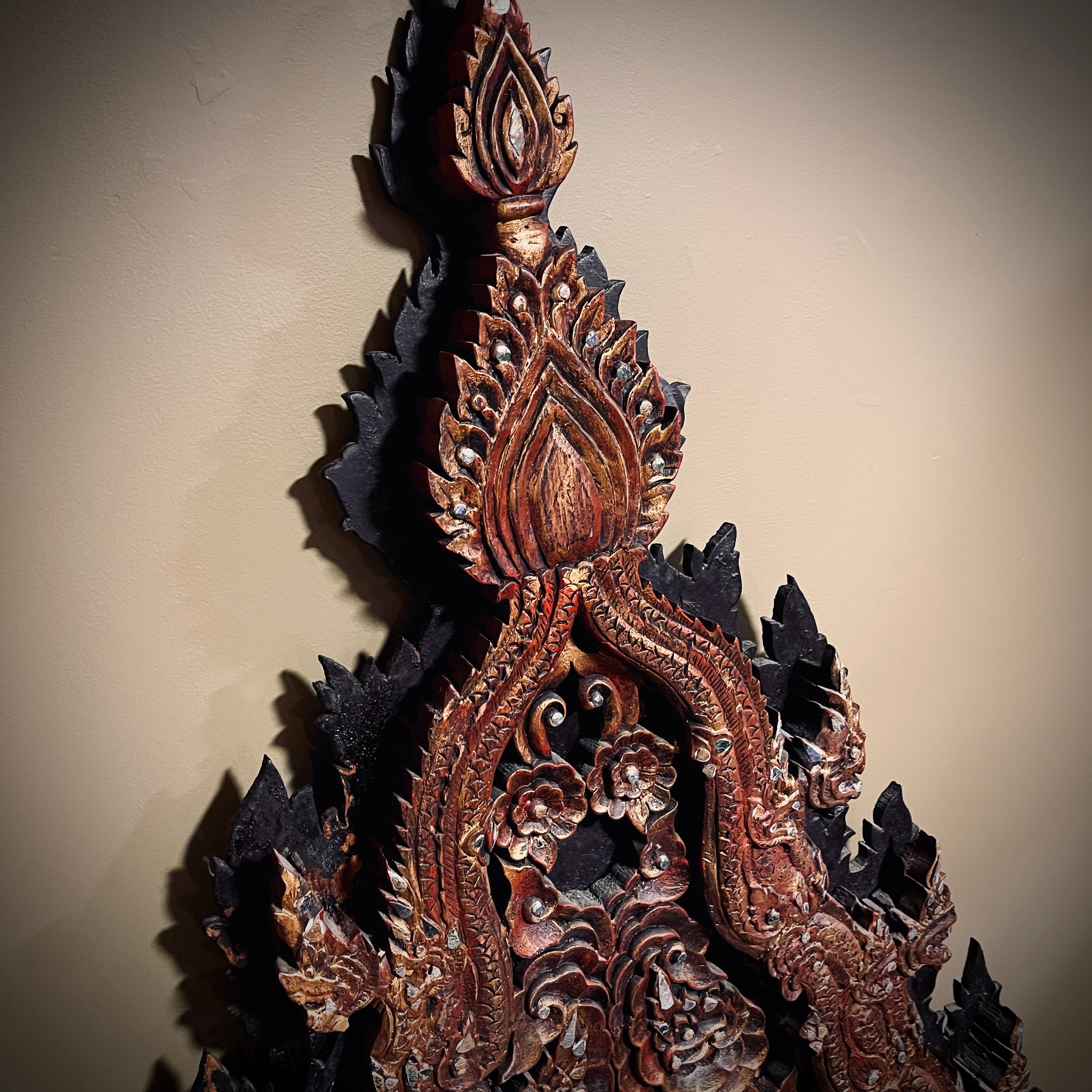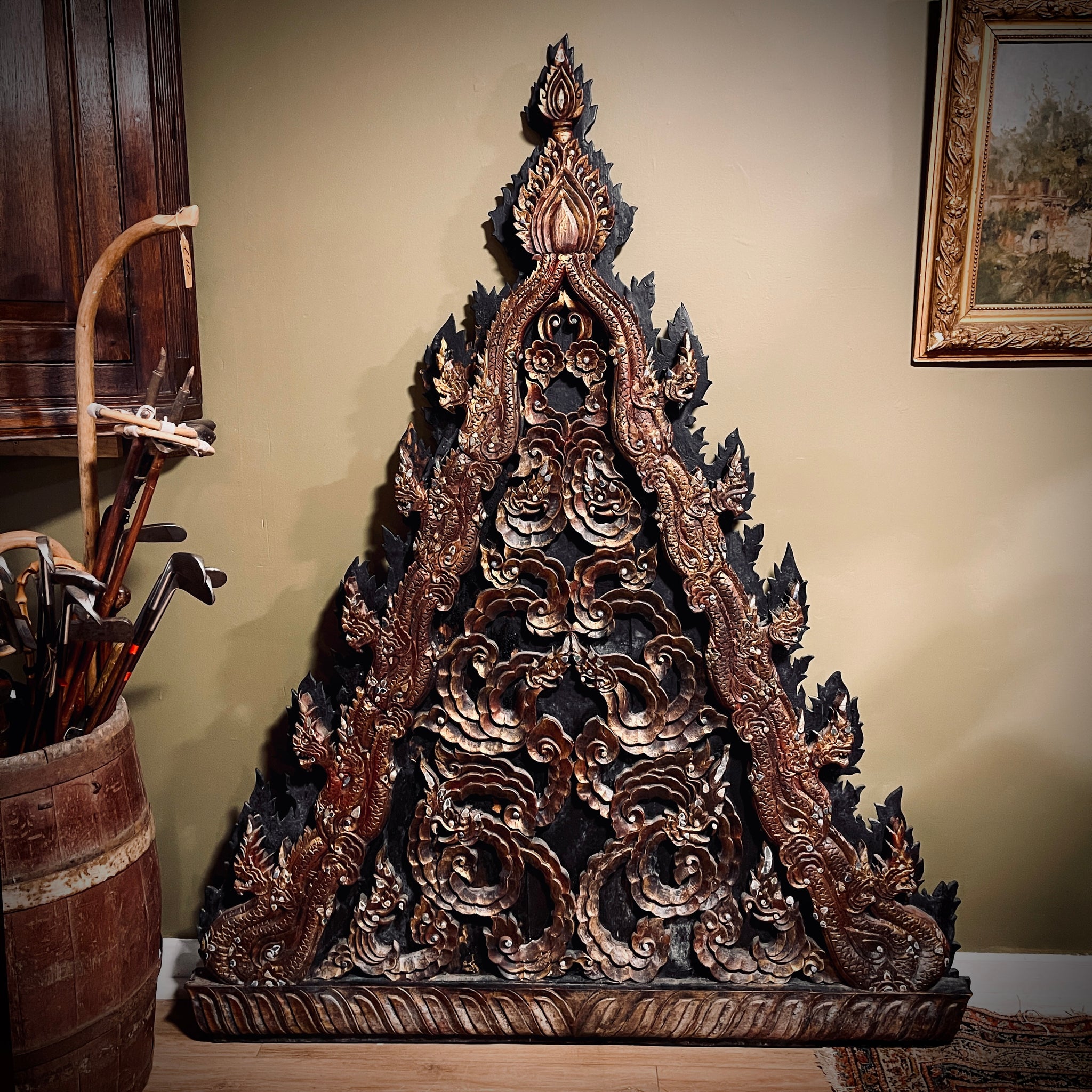 This ornate wooden temple pediment is an extraordinary piece of architectural carving. Richly detailed with layered scrolling flames, sinuous Naga serpents and fragments of mirrored glass, its dramatic triangular form commands attention whether leaned against a wall or mounted as a statement focal point.