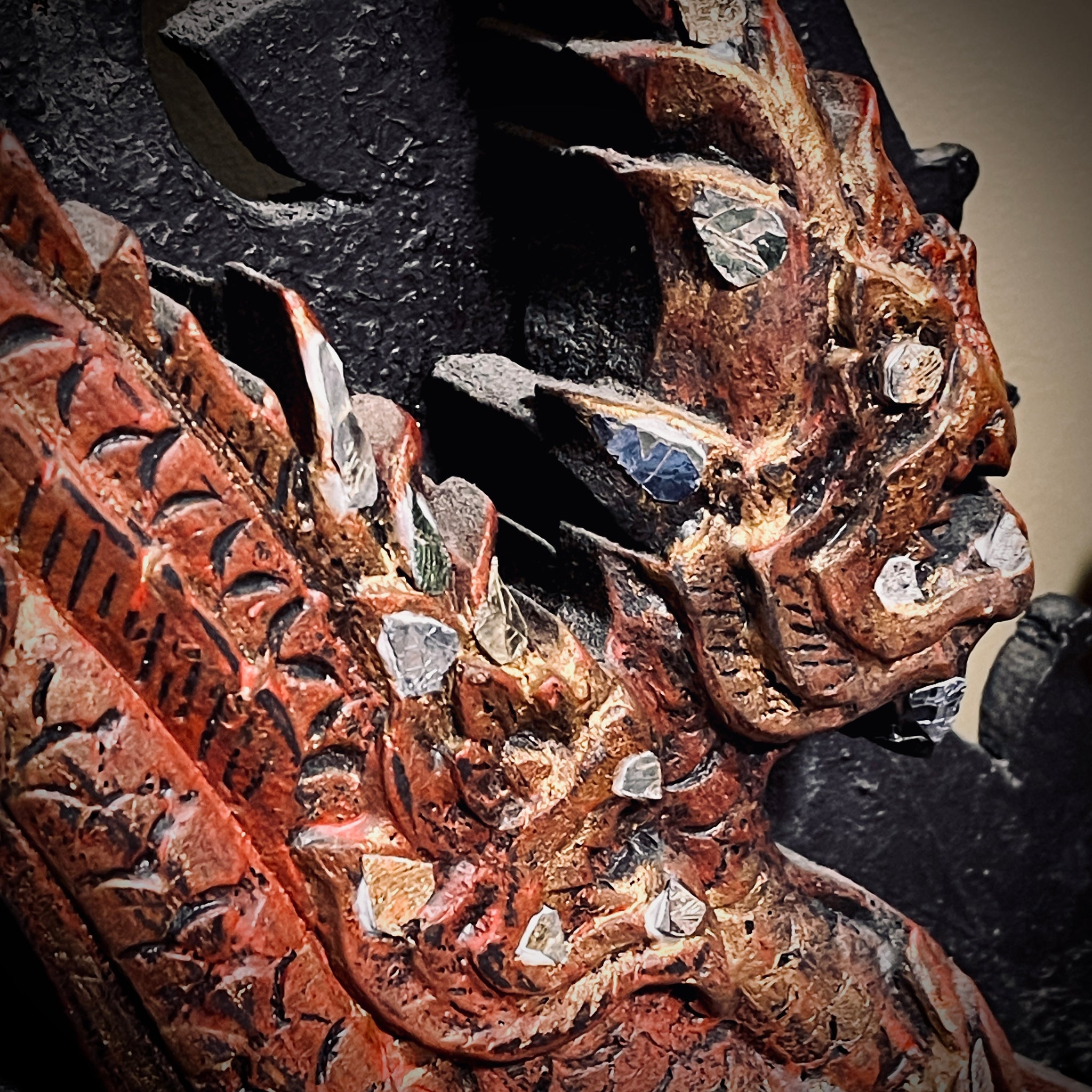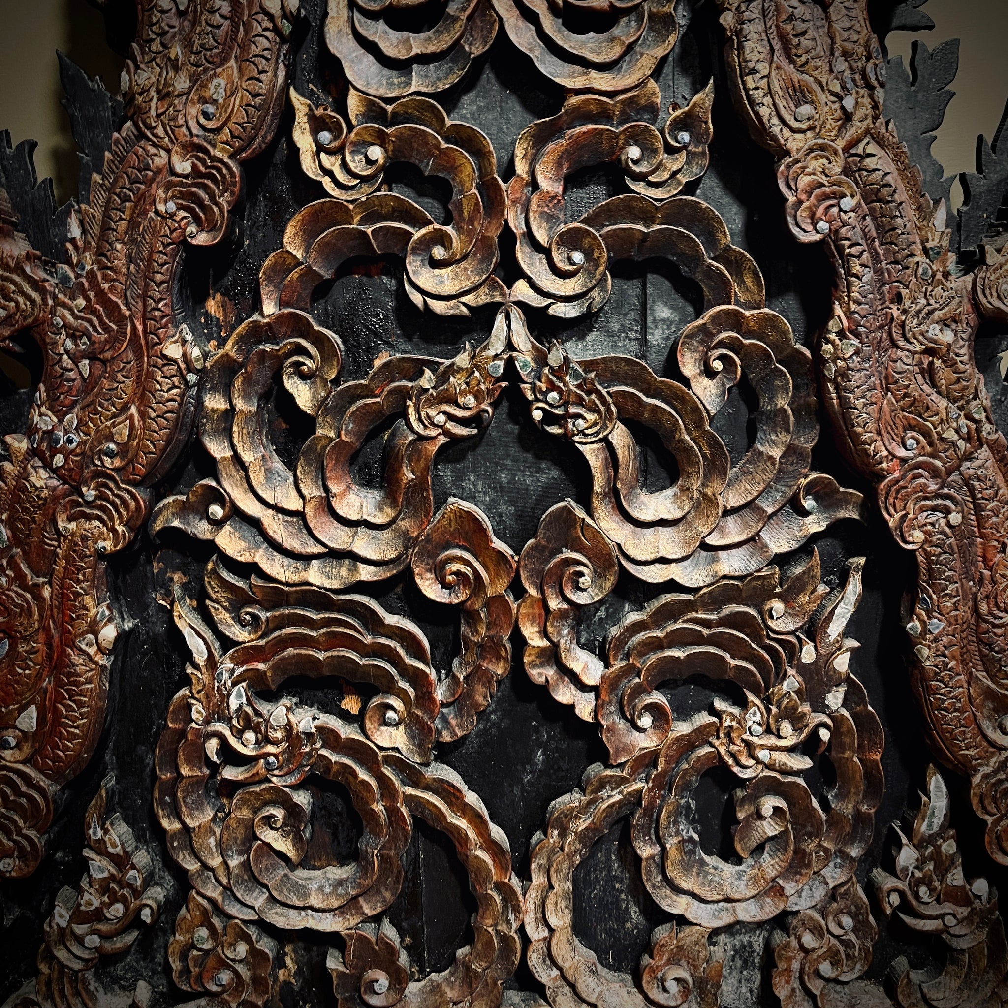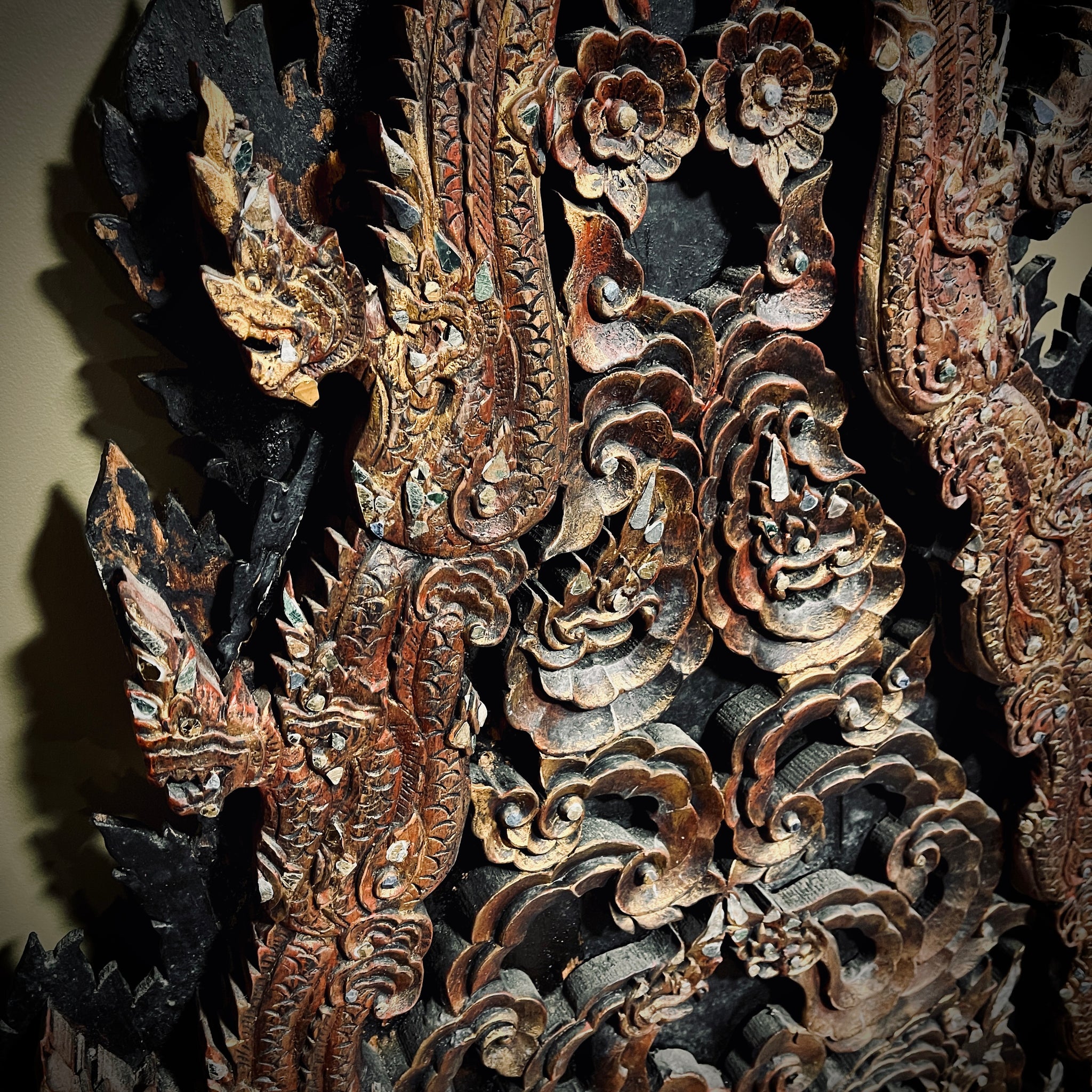 This ornate wooden temple pediment is an extraordinary piece of architectural carving. Richly detailed with layered scrolling flames, sinuous Naga serpents and fragments of mirrored glass, its dramatic triangular form commands attention whether leaned against a wall or mounted as a statement focal point.