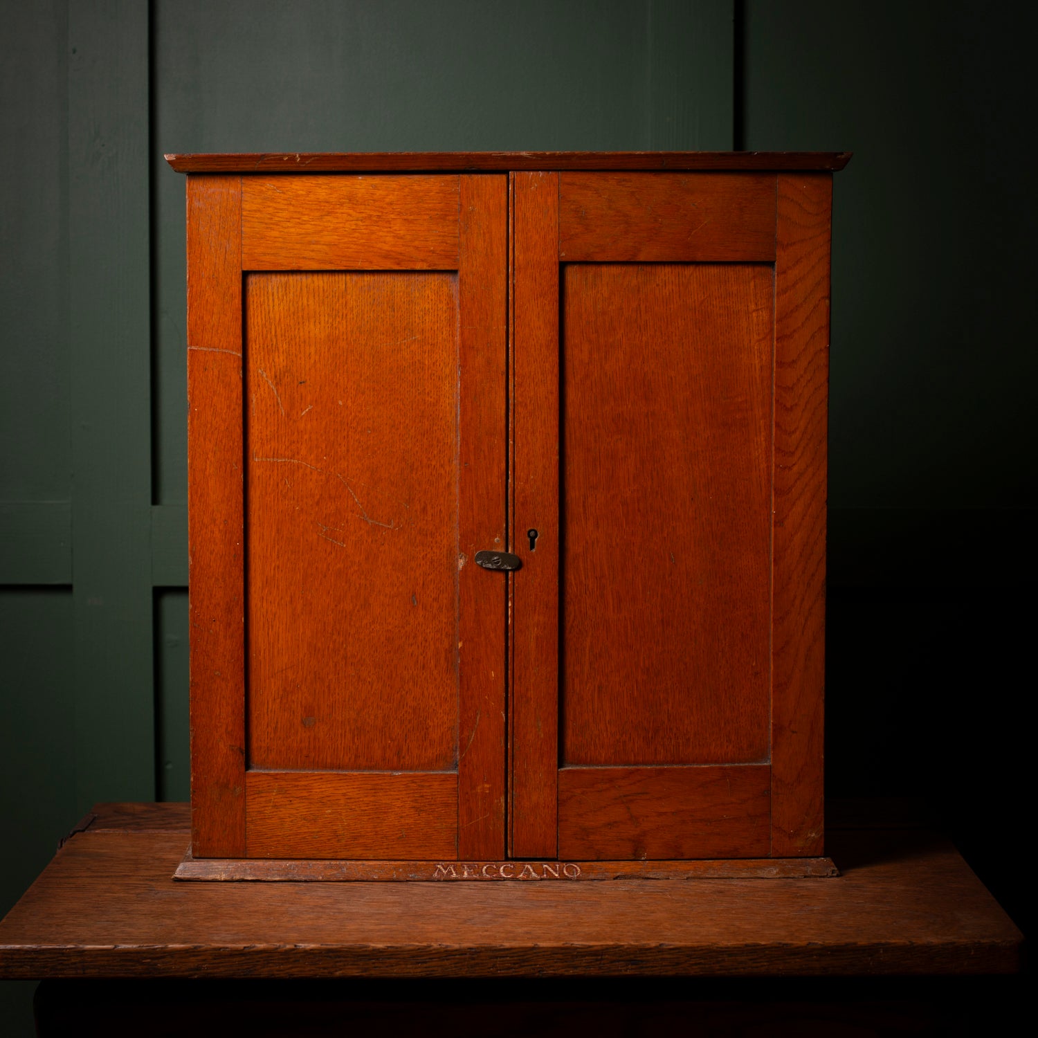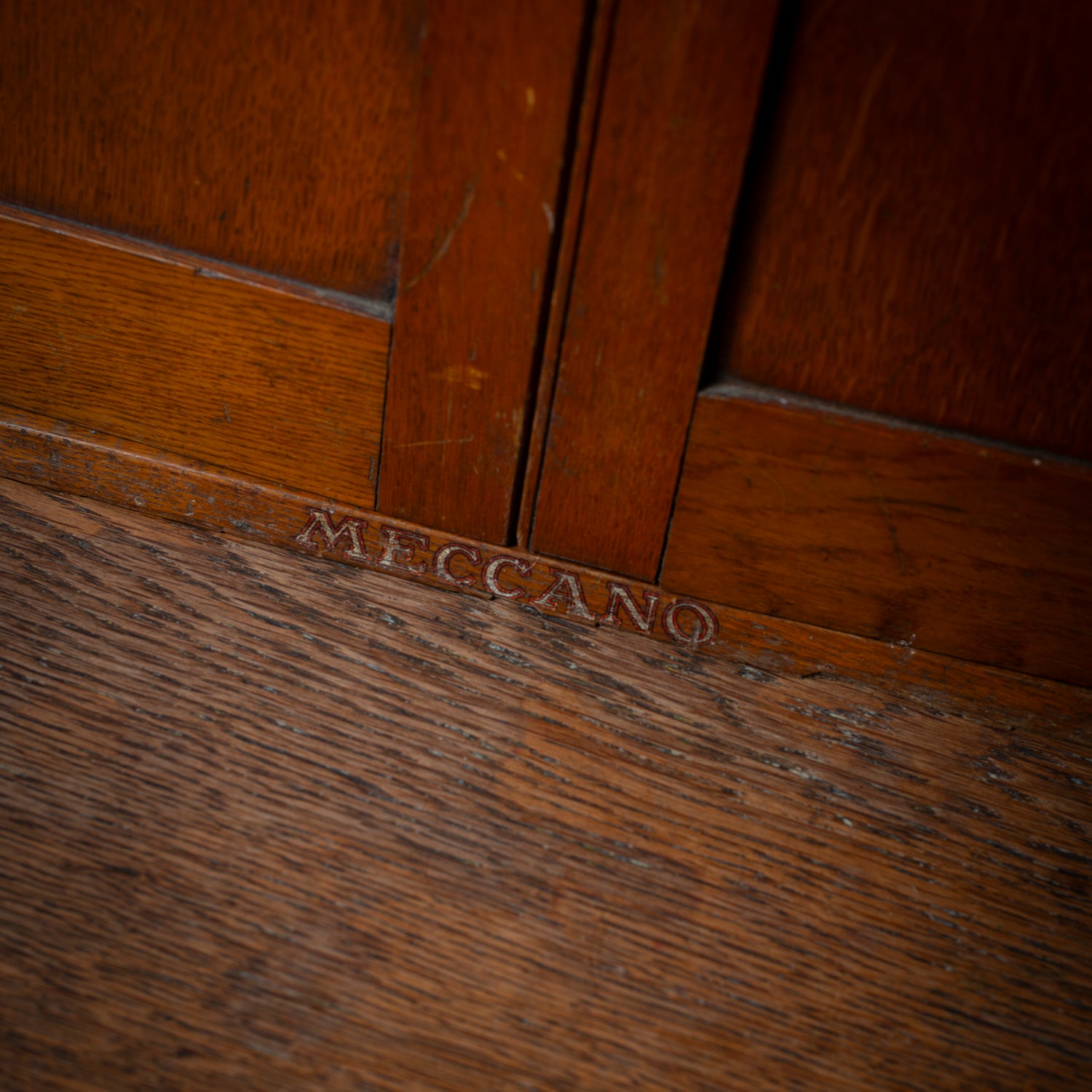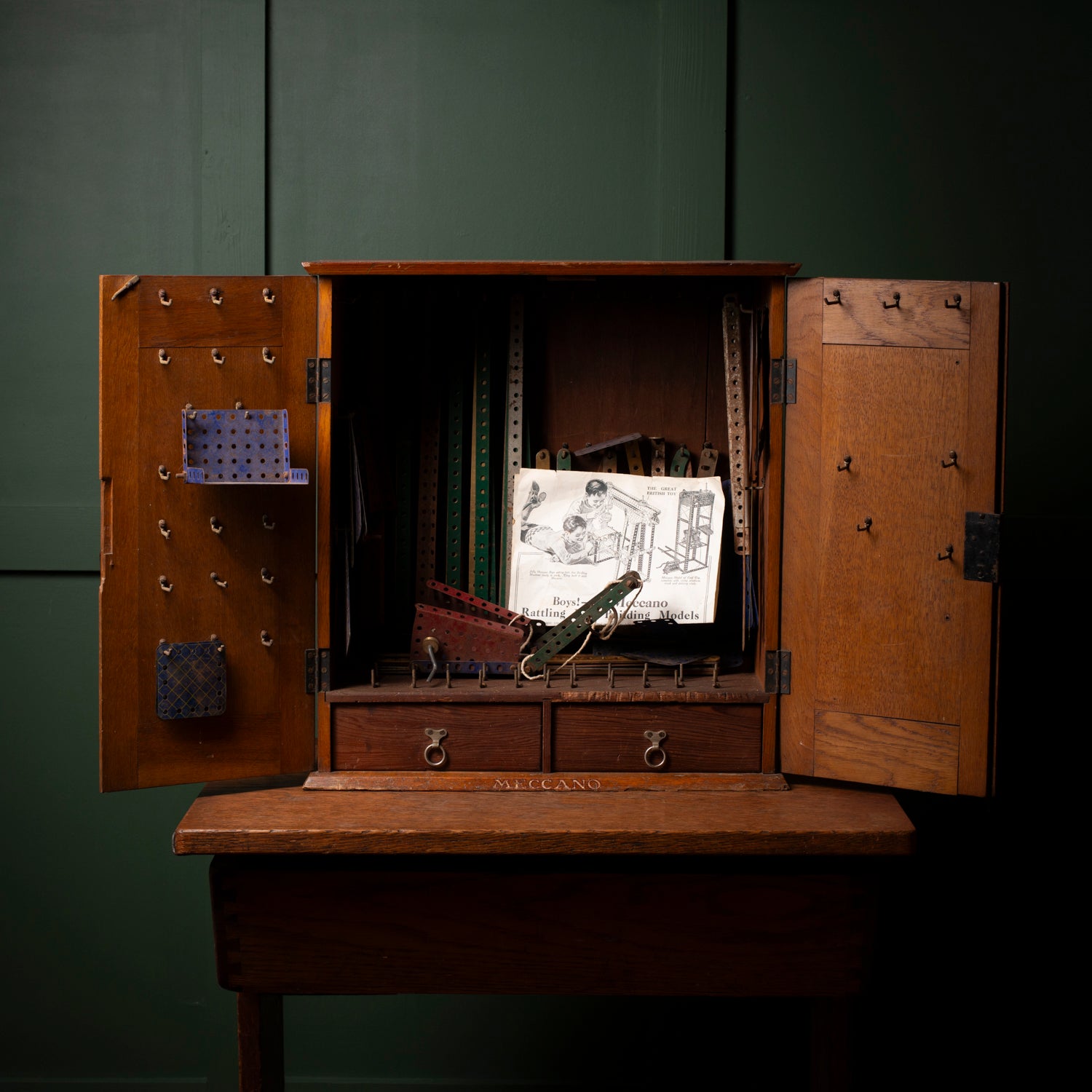 A rare survivor from the early days of Meccano, this 1916 oak display cabinet would have been used in shops to hold and display Meccano construction sets. The internal fittings are largely original and include painted metal strips, brackets and fixings, as well as a Meccano manual. With dovetail joinery, and the word “Meccano” stencilled to the base, it’s a superb piece of early 20th-century educational toy history.