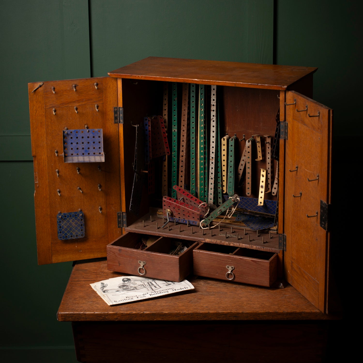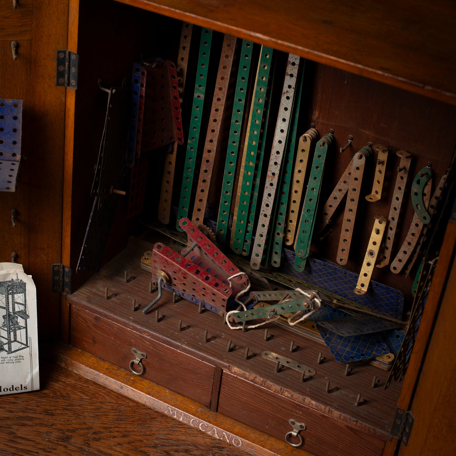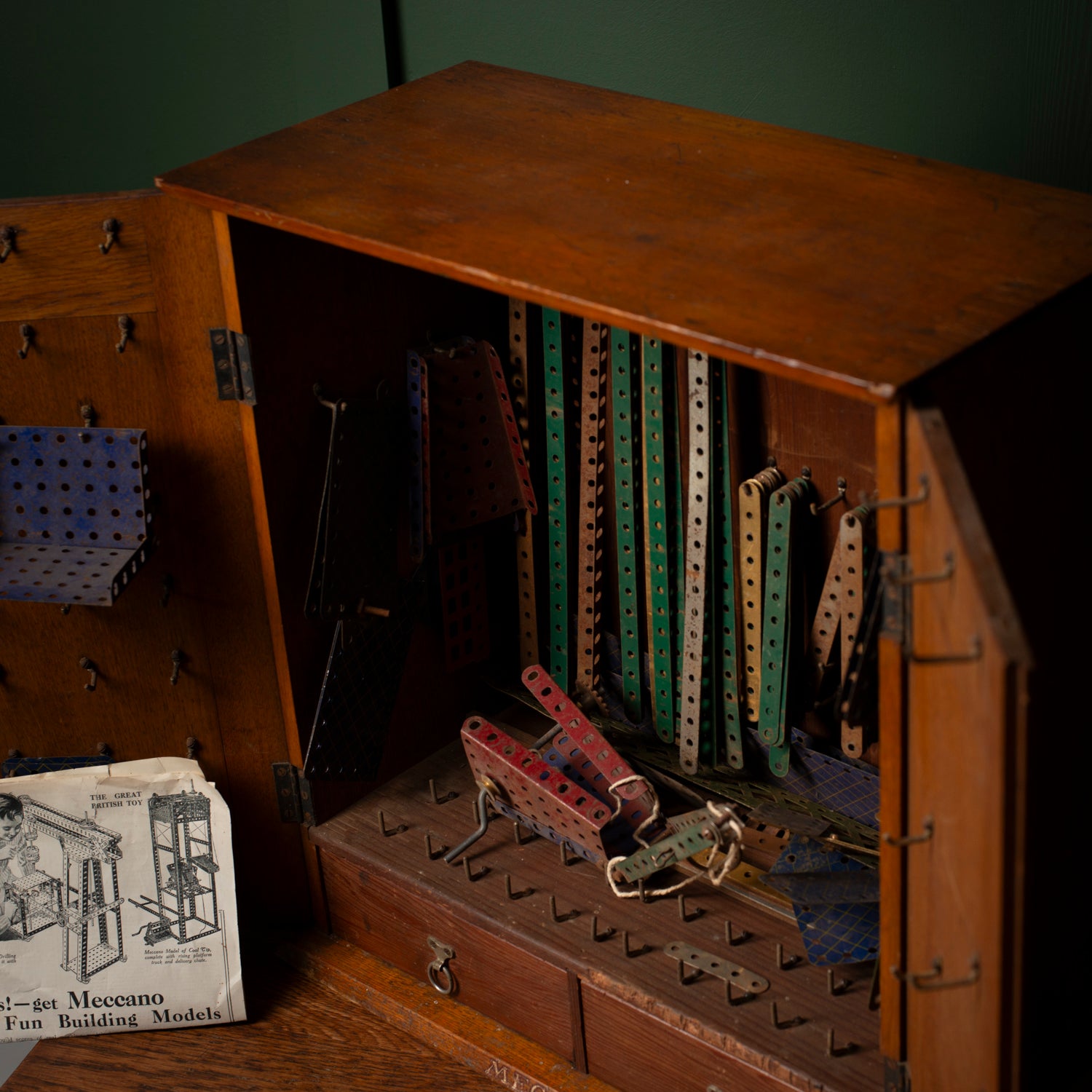 A rare survivor from the early days of Meccano, this 1916 oak display cabinet would have been used in shops to hold and display Meccano construction sets. The internal fittings are largely original and include painted metal strips, brackets and fixings, as well as a Meccano manual. With dovetail joinery, and the word “Meccano” stencilled to the base, it’s a superb piece of early 20th-century educational toy history.