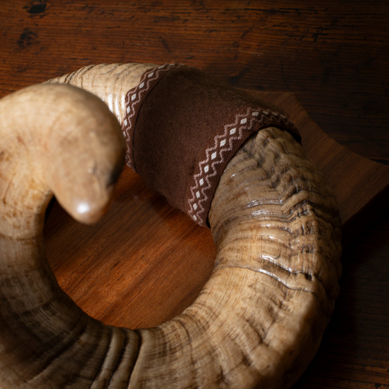 Materials: Natural ram’s horn, wool felt, hardwood shield