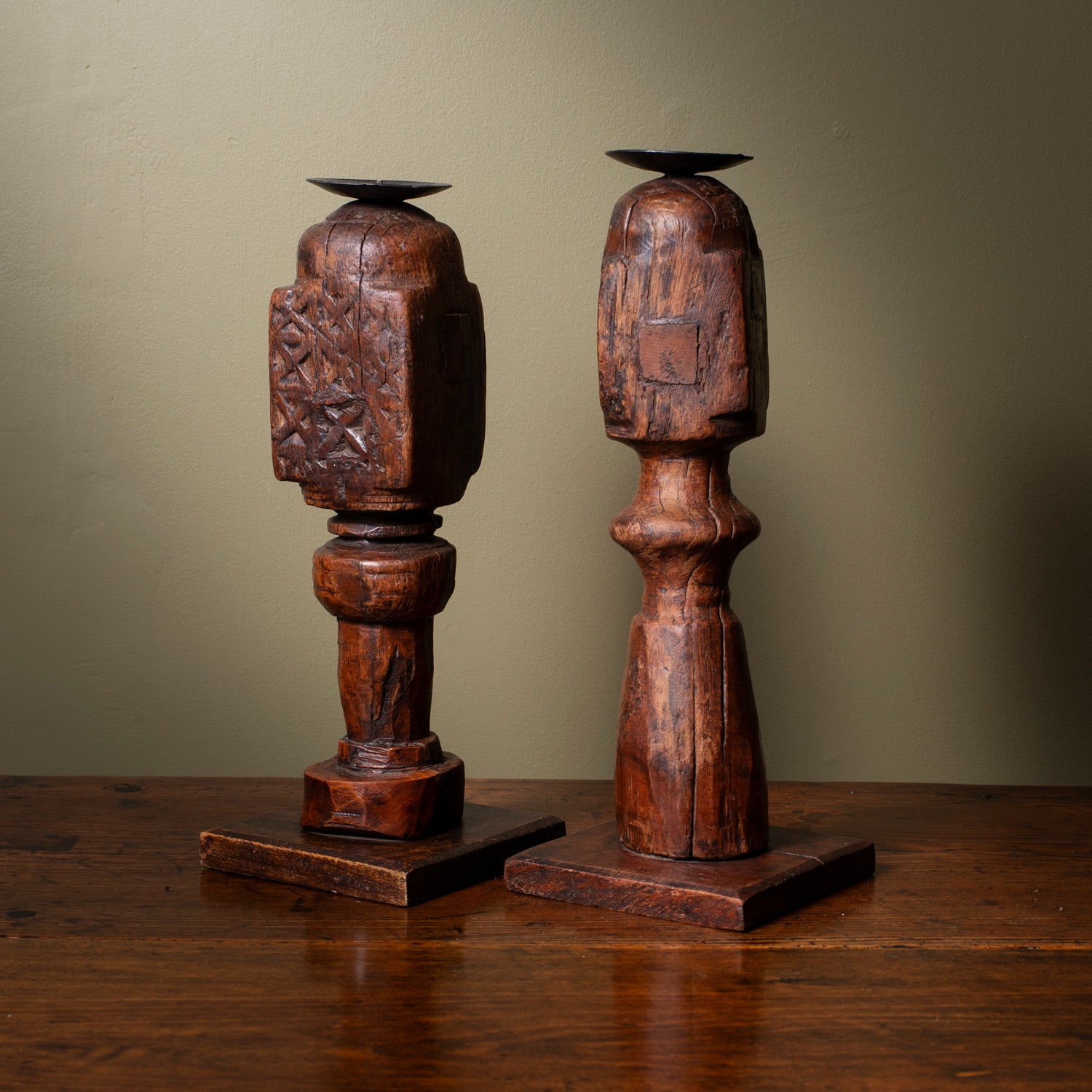 A striking pair of rustic candlestick holders, each repurposed from carved antique bed legs. Their weighty presence, timeworn patina, and hand-tooled details bring character and depth to a space. The iron prickets are later additions, creating practical use while preserving the spirit of their past.