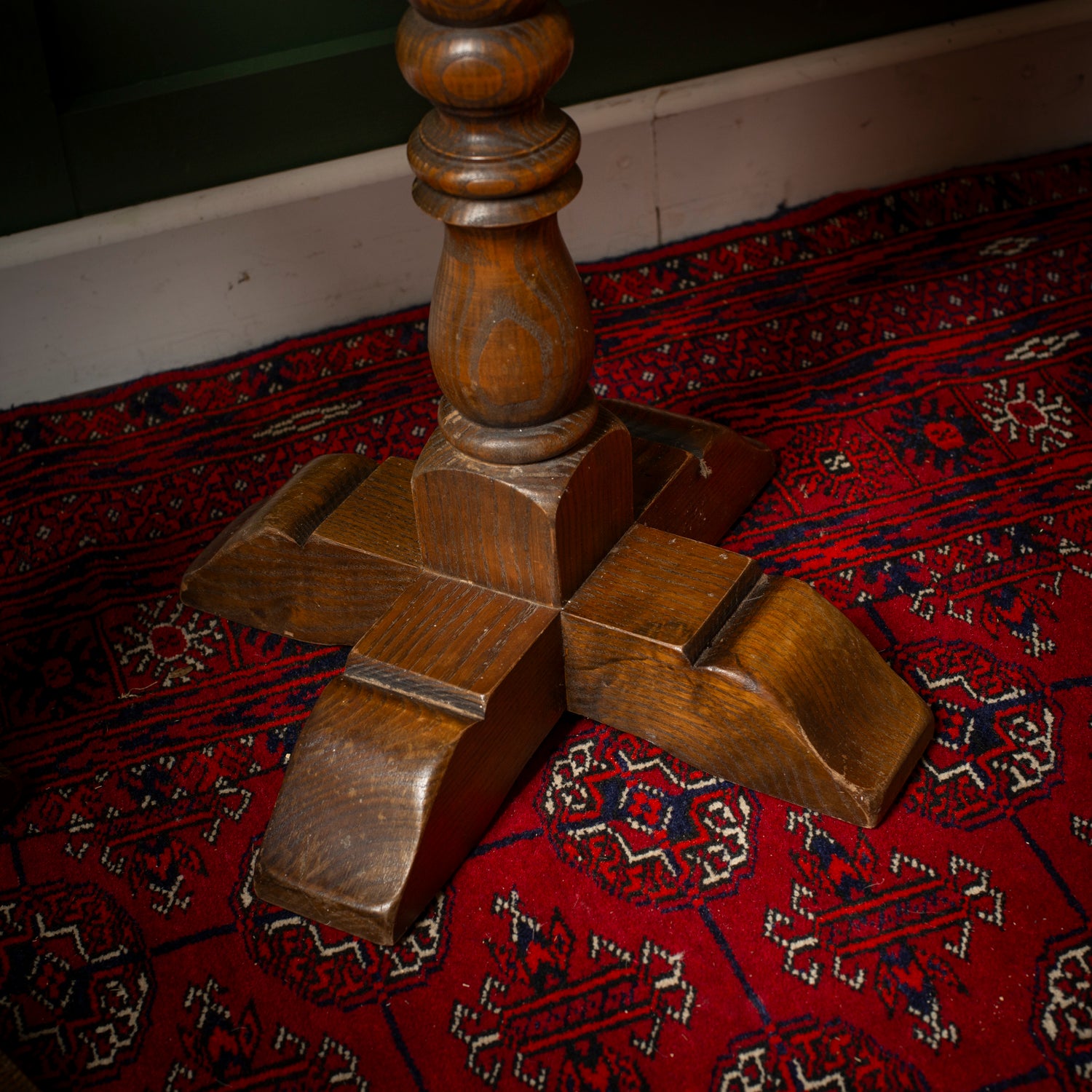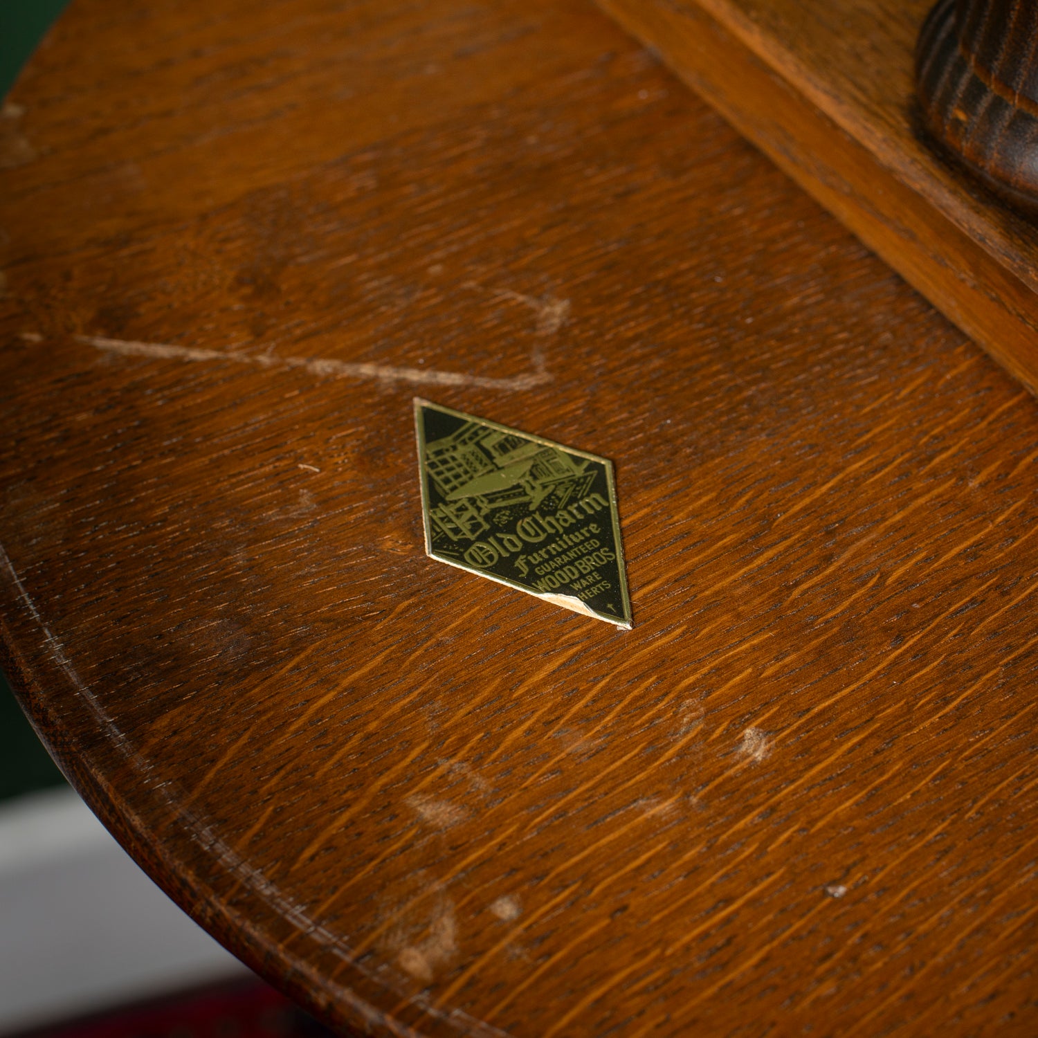 A practical pair of solid oak "Old Charm Furniture" wine tables by Wood Bros, Ware, Herts. Made in England in the mid-20th century, each has a turned baluster stem and a sturdy, four-footed base. Matching in design, they’re ideal for use beside a chair or in small spaces where surface area matters.