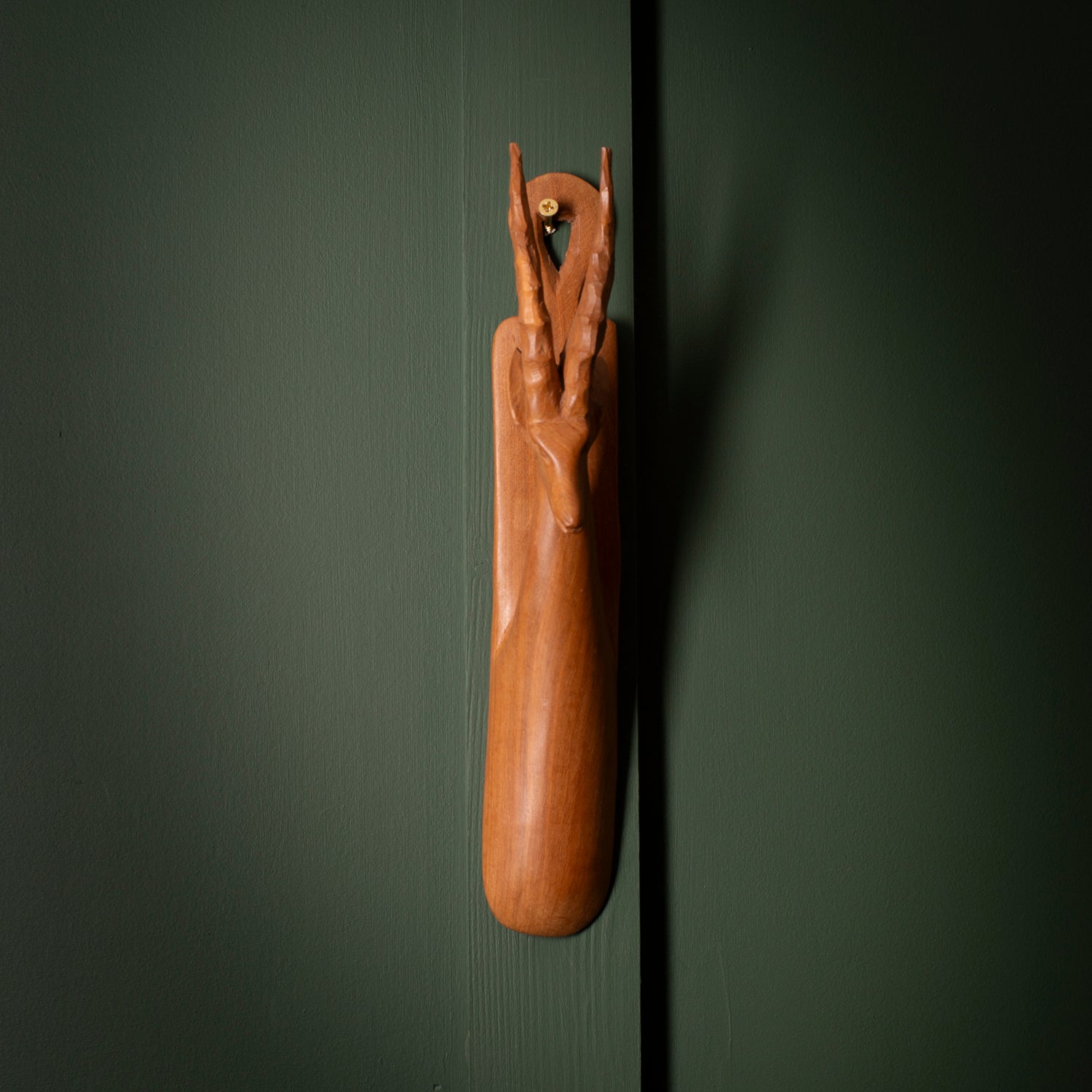 A beautifully hand-carved wooden wall piece featuring an antelope in profile, finished in a smooth, warm-toned wood. This mid-century decorative item blends craftsmanship with a naturalistic design and makes a simple but striking feature on any wall. Its vertical form and stylised shape are especially well suited to narrow spaces or gallery-style arrangements.