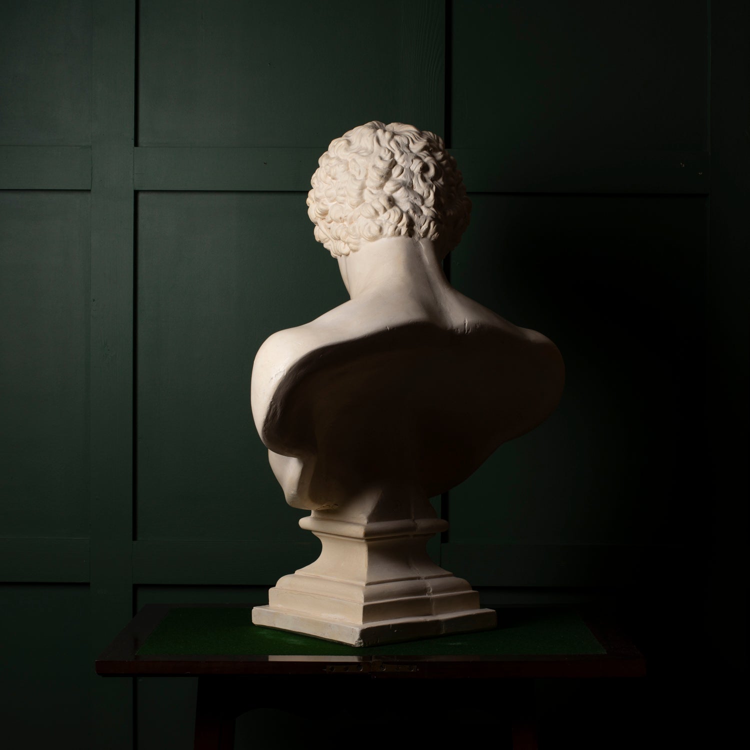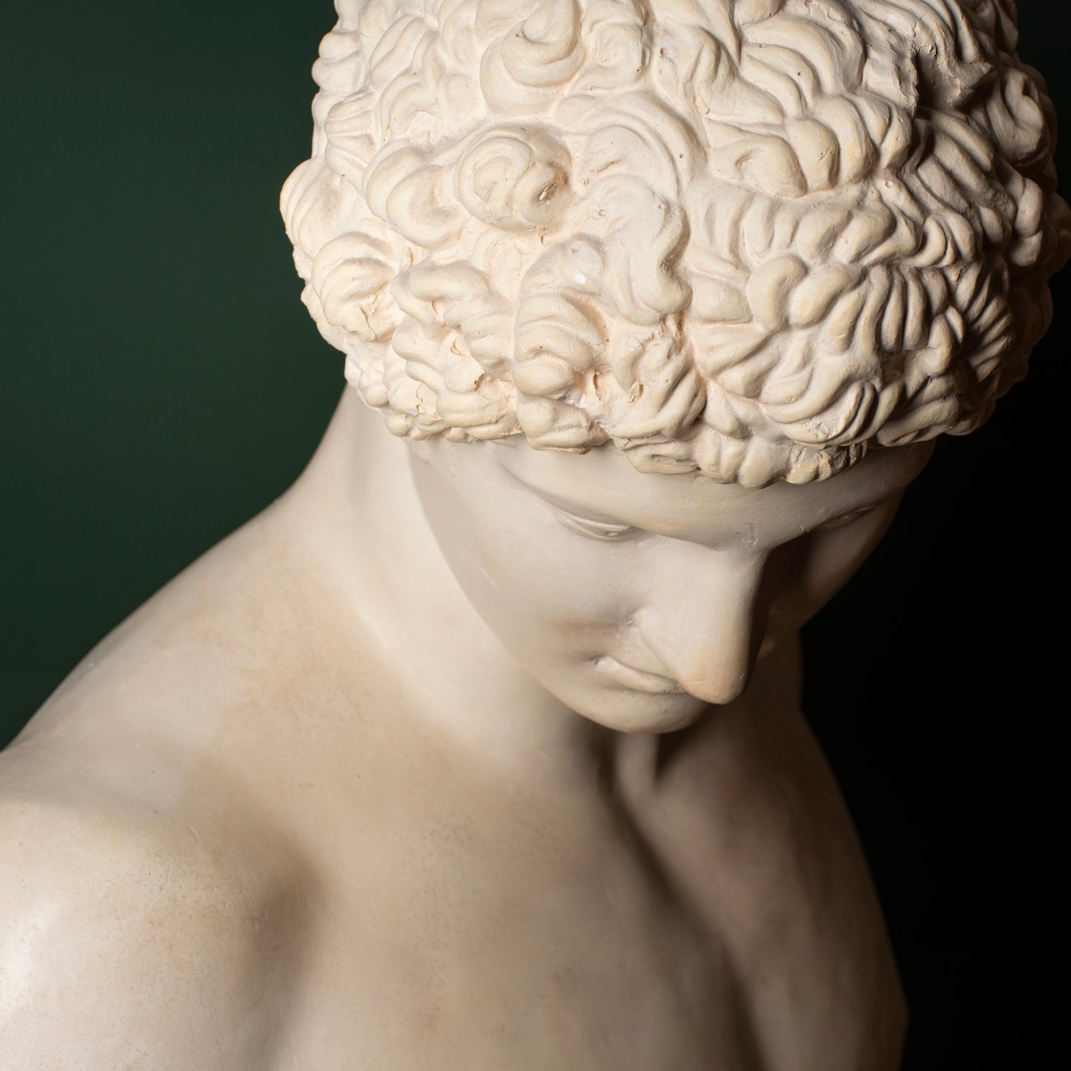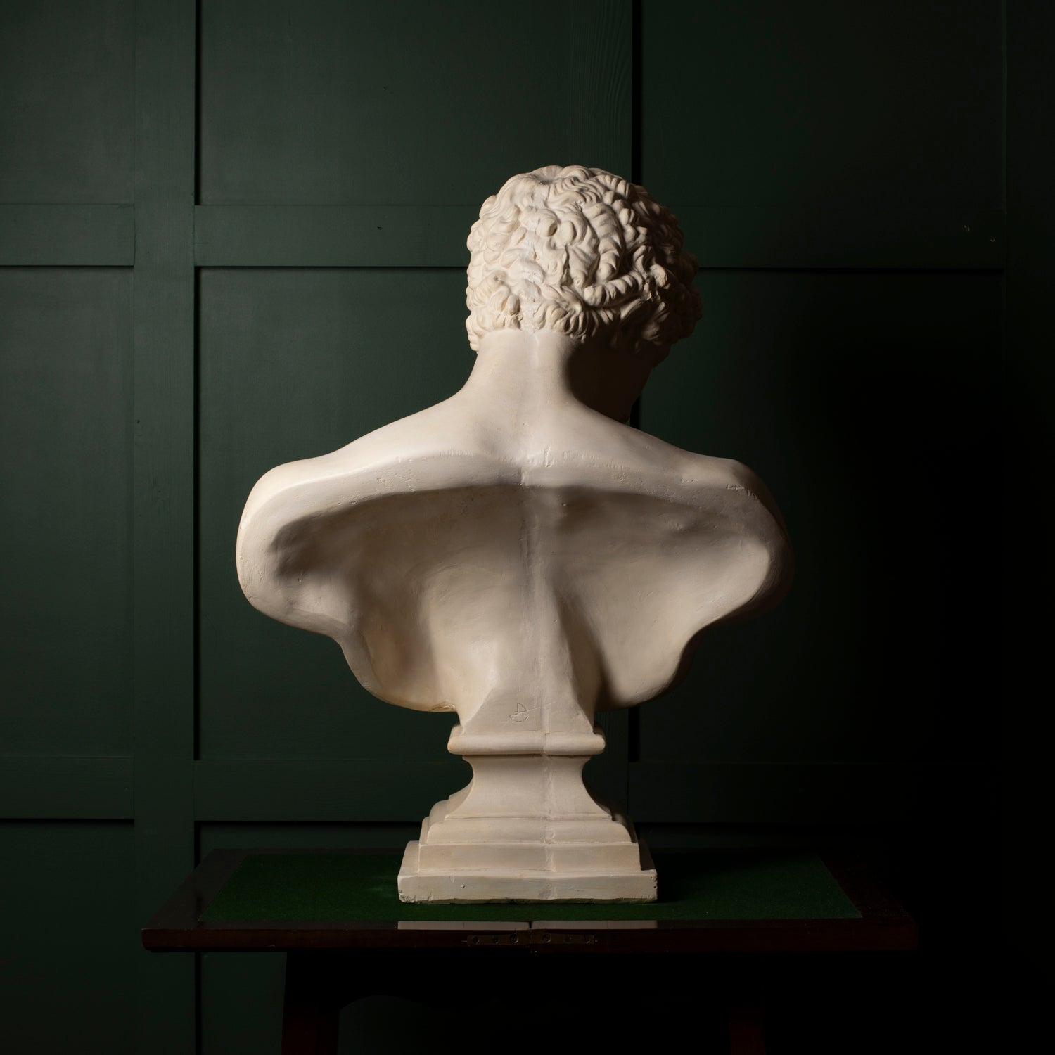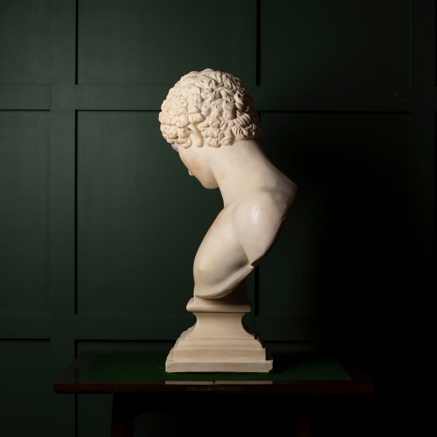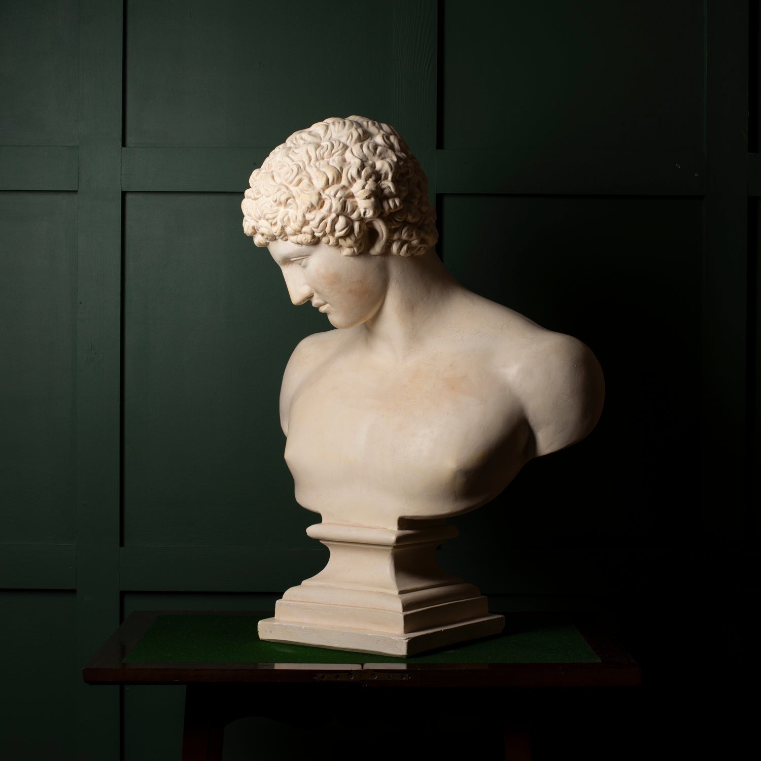 A striking plaster bust of Antinous, capturing the classical beauty and serene melancholy for which he is renowned. This sculptural piece reflects the neoclassical revival of the late 19th and early 20th centuries, when fascination with Greco-Roman antiquity flourished among collectors, artists, and institutions.