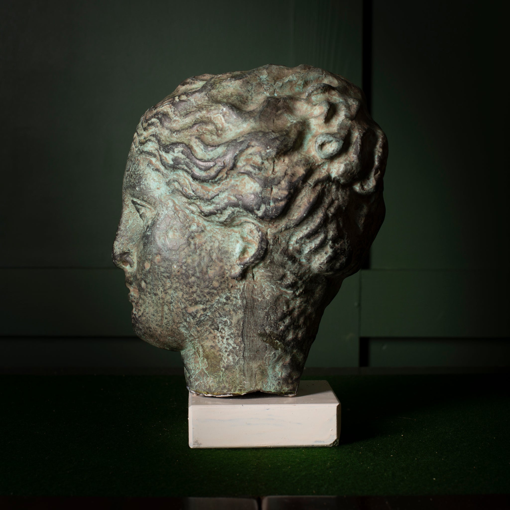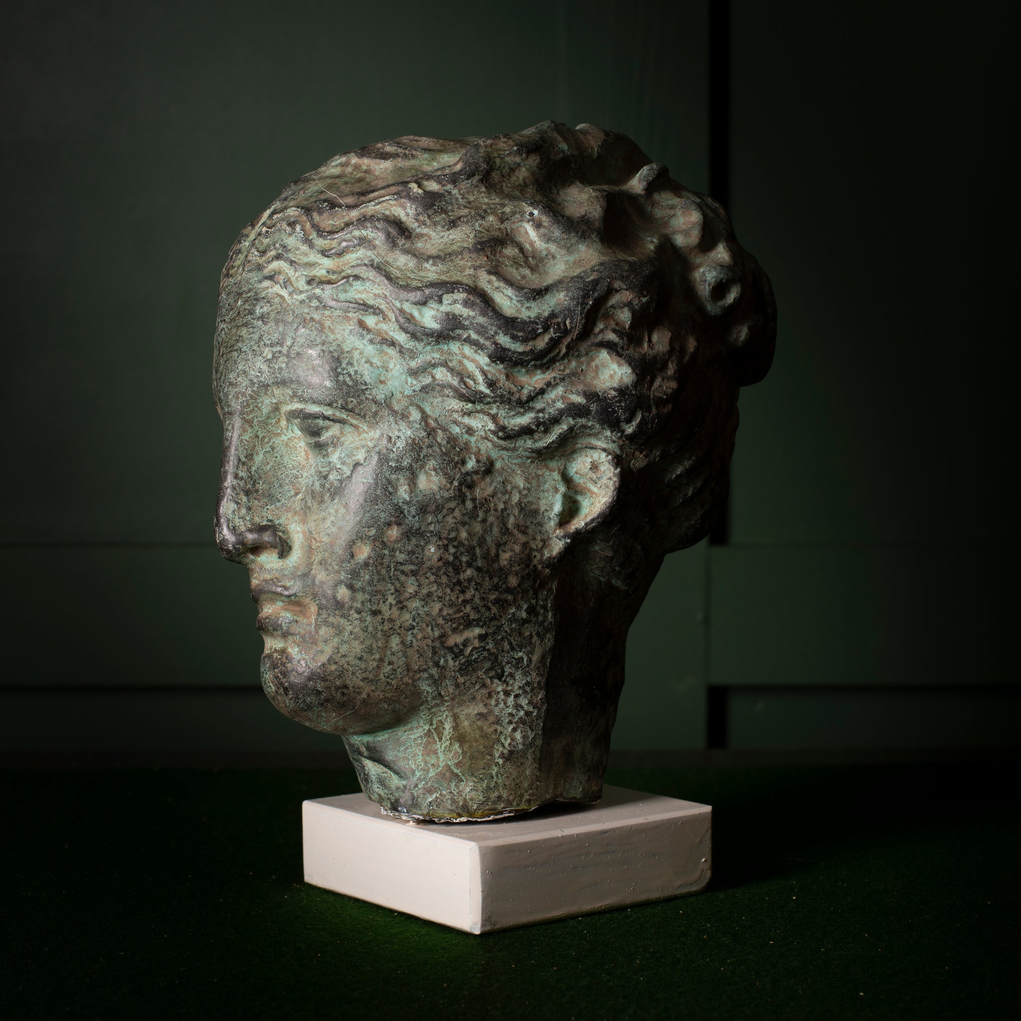 A plaster bust depicting Hygieia, the Greek goddess associated with health and cleanliness. This example has a textured surface with an aged bronze-style finish and is mounted on a simple square base. The bust shows intentional patination and cast detail throughout the hair and facial features. A decorative piece suited to classical, eclectic, or curated interiors.