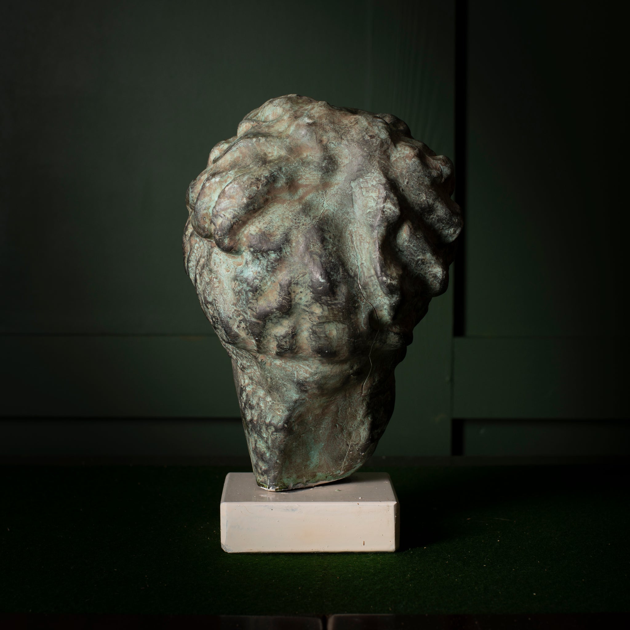 - Materials: Plaster with faux-bronze patinated finish; painted base