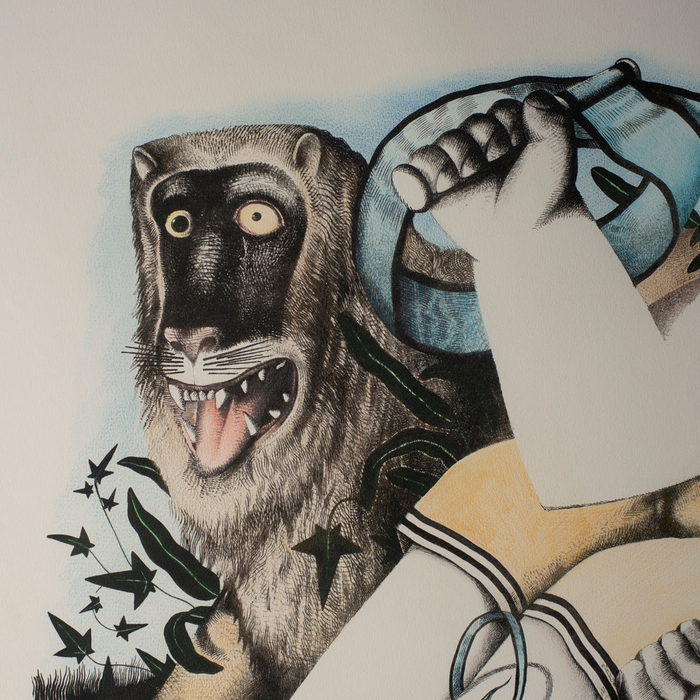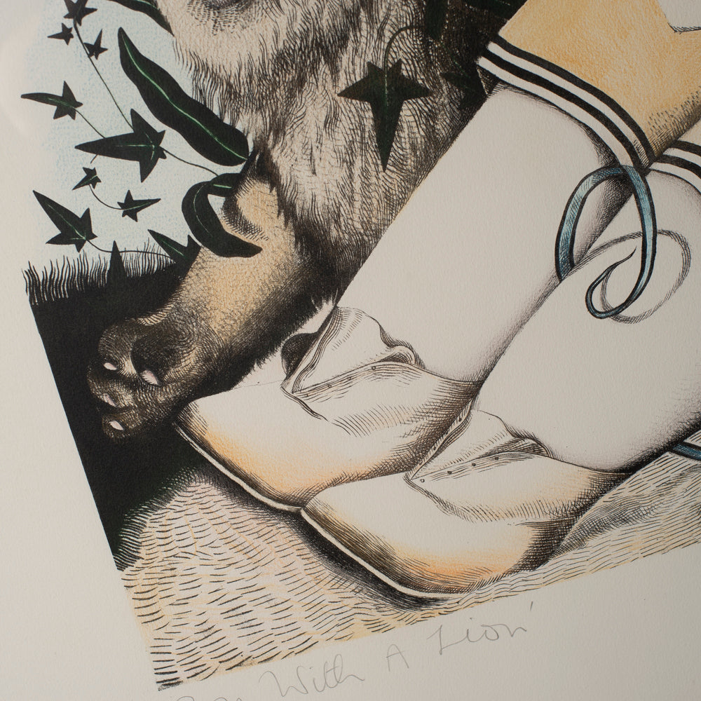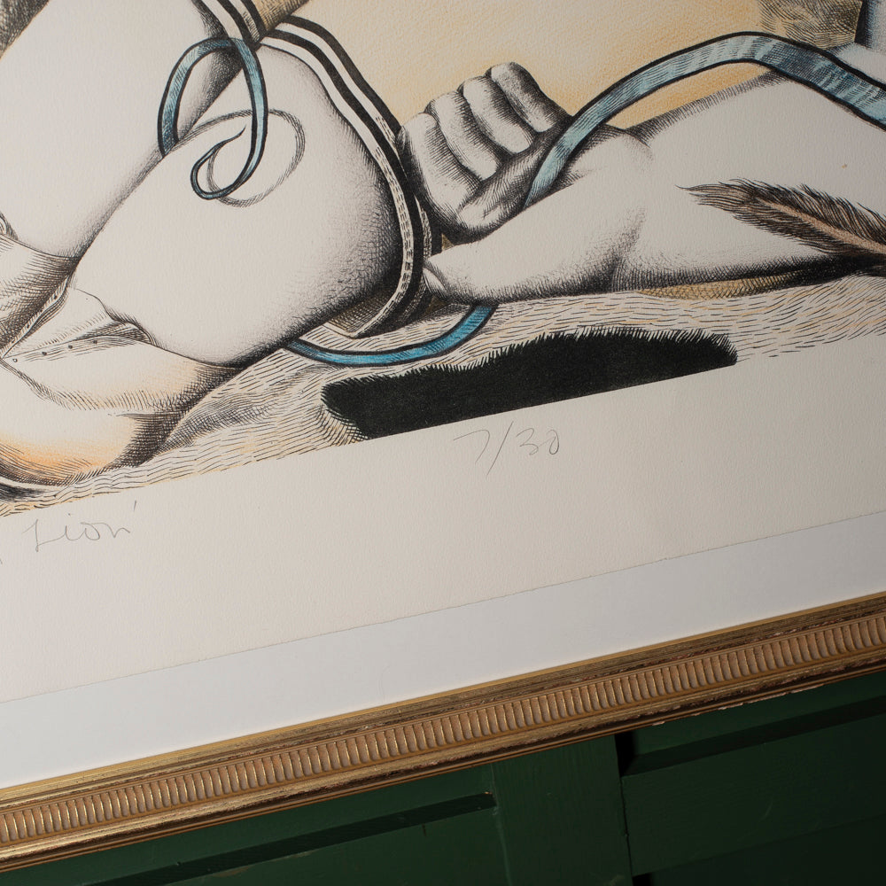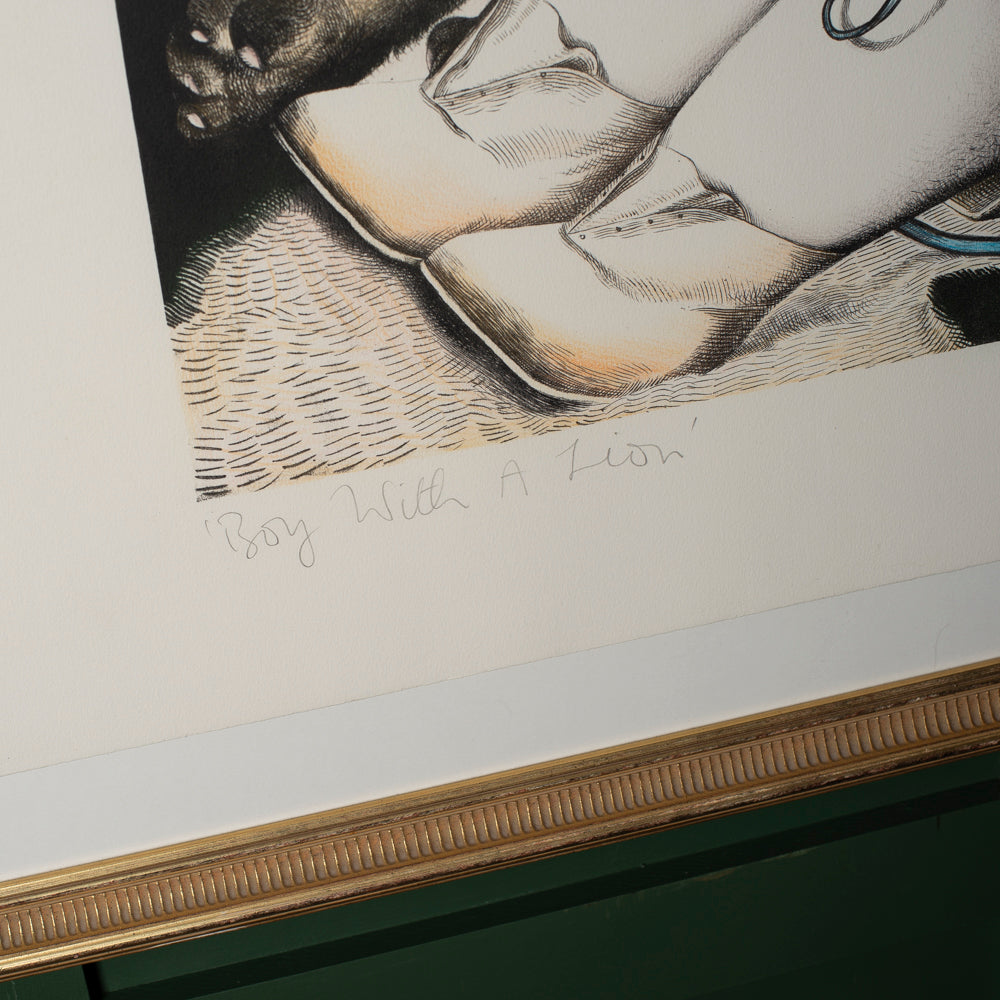 A striking and thought-provoking work by celebrated Scottish artist John Byrne, this original limited edition print dates to the mid-1990s, a particularly important period in Byrne’s graphic output. Titled Boy With A Lion, the composition brings together Byrne’s unmistakable figurative style with symbolic narrative — the youthful figure reclining beside a lion, bound together in a scene that feels both playful and quietly unsettling.