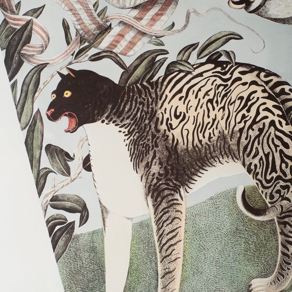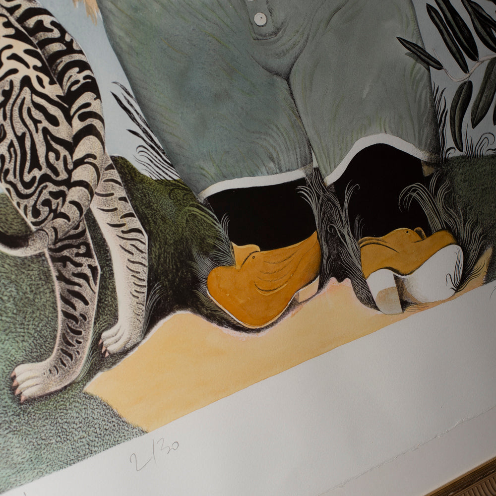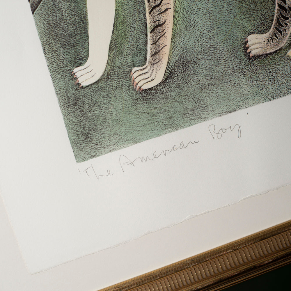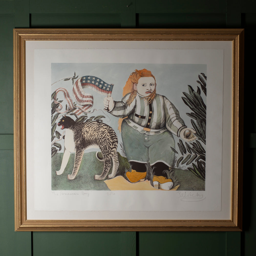 The image combines a childlike figure, a stylised animal companion and an American flag motif, rendered in Byrne’s distinctive linear style and finished with hand-applied colour. As with much of his work from this period, the piece balances humour and unease, drawing on folk art, mythology and social observation. Individually numbered 2/30 and signed in pencil “Patrick”, this is a scarce example from a limited run rarely seen intact and professionally framed.