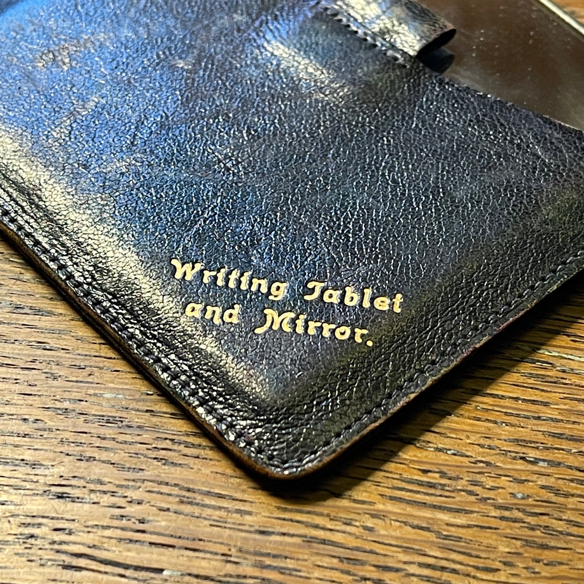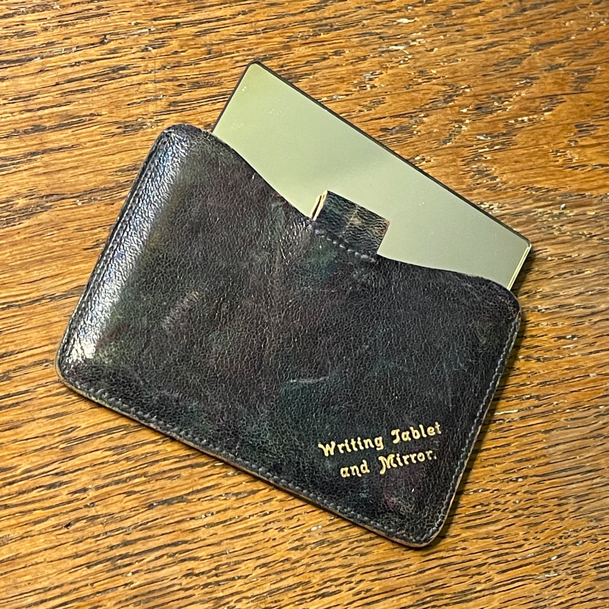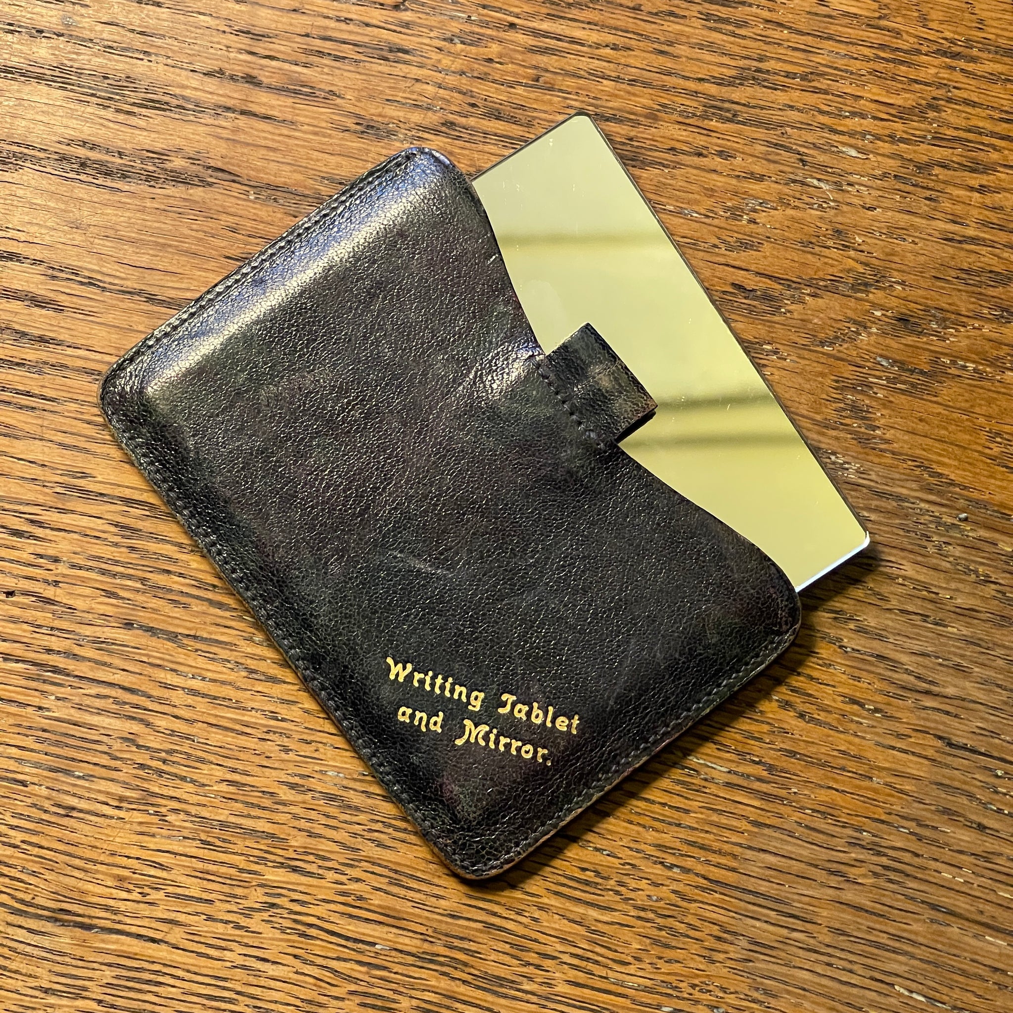 A charming vintage writing tablet and mirror housed in its original leather case. Compact and discreet, this small personal accessory was designed for everyday use, combining a mirrored panel with a smooth writing surface concealed within. The exterior shows gentle wear consistent with age, while the gold-lettered title adds a subtle decorative detail. A pleasingly functional object that reflects a slower, more deliberate era of correspondence and personal ritual.