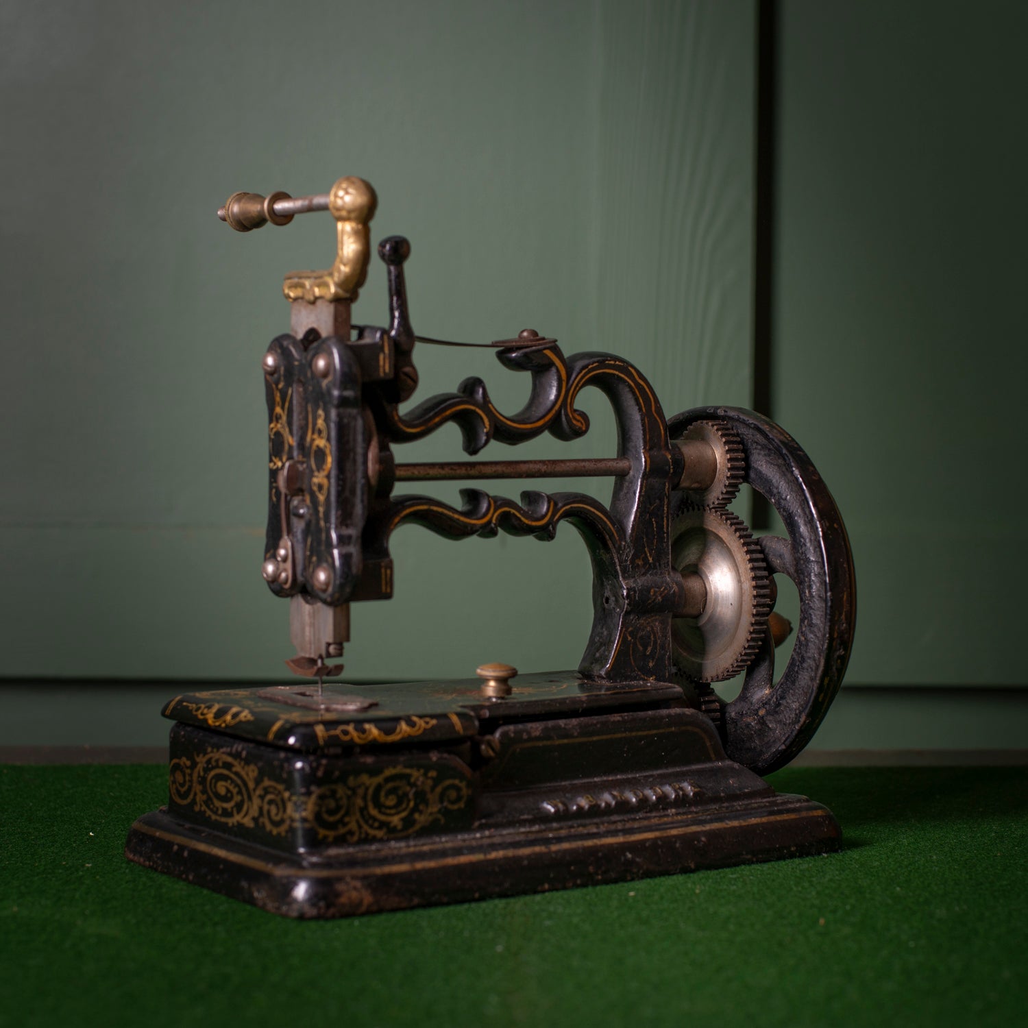 - Materials: Cast iron machine with gilt decoration; wooden case with brass fittings