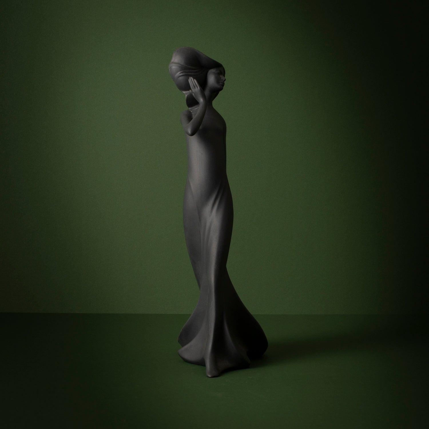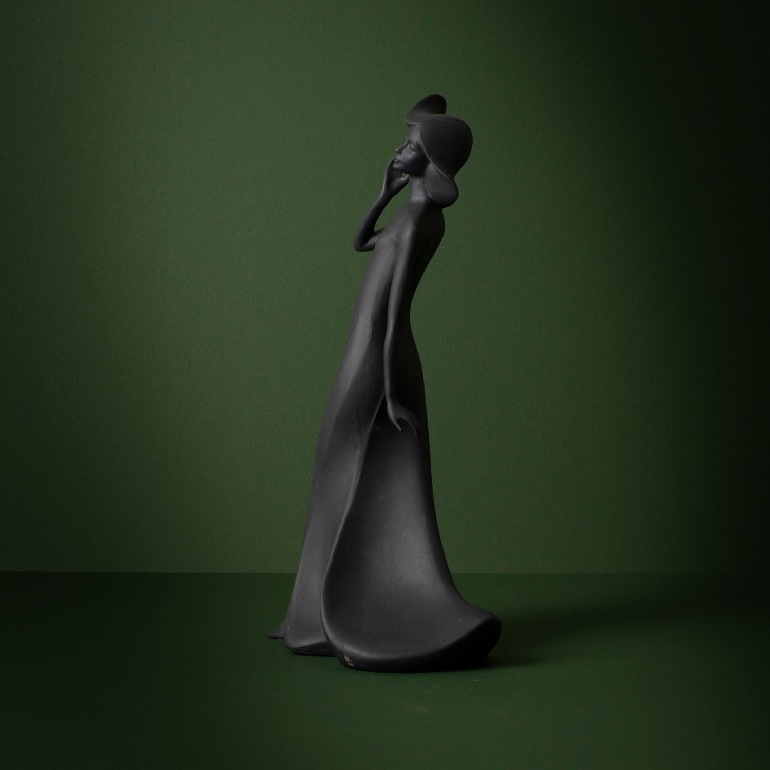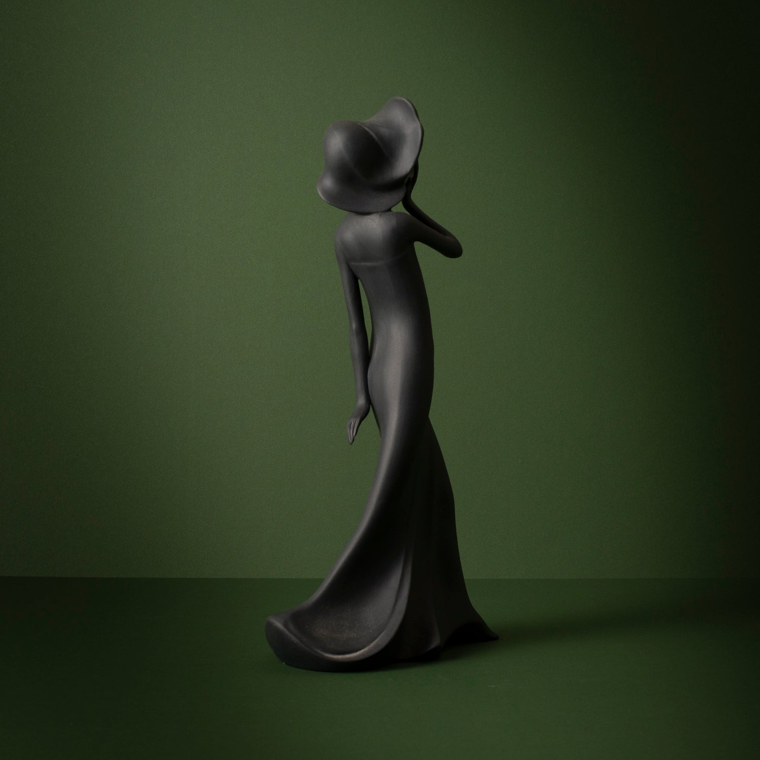 Royal Doulton Images figurine titled ‘Carefree’. A tall ceramic sculpture of a woman in a long dress with a wide-brimmed hat. Finished in matte black with a stylised form and clean lines. Part of the modern Images range.