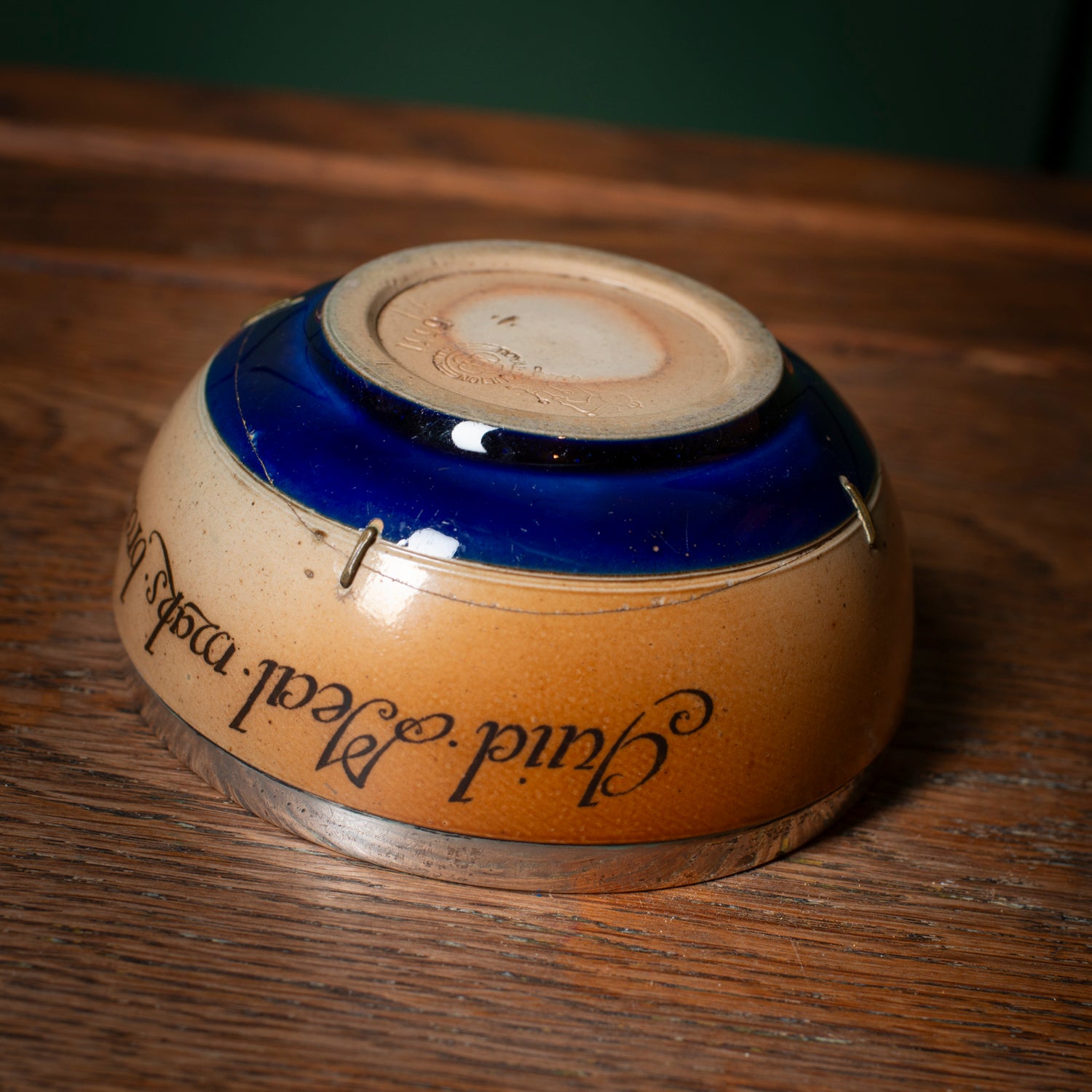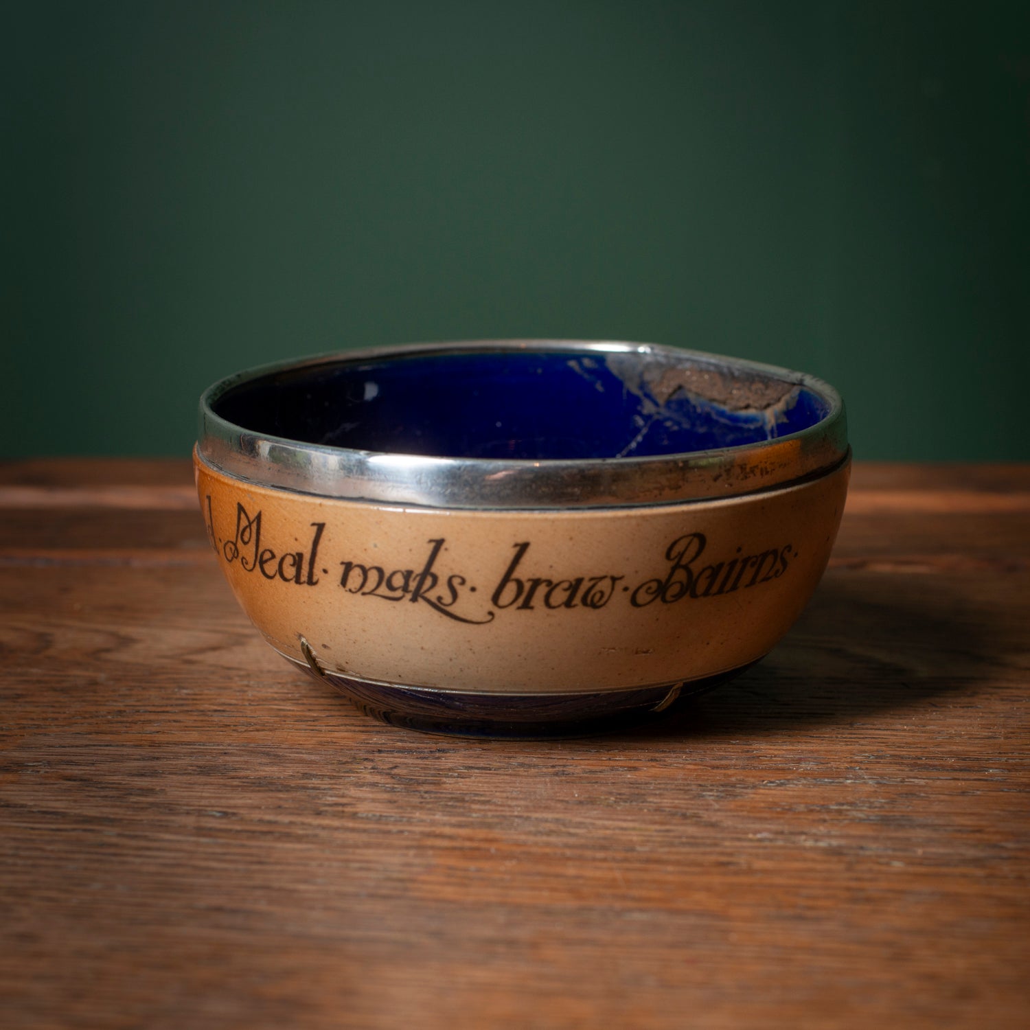 A Royal Doulton mottoware bowl with a silver rim, featuring the Scots dialect motto “Guid Meal maks braw Bairns.”
