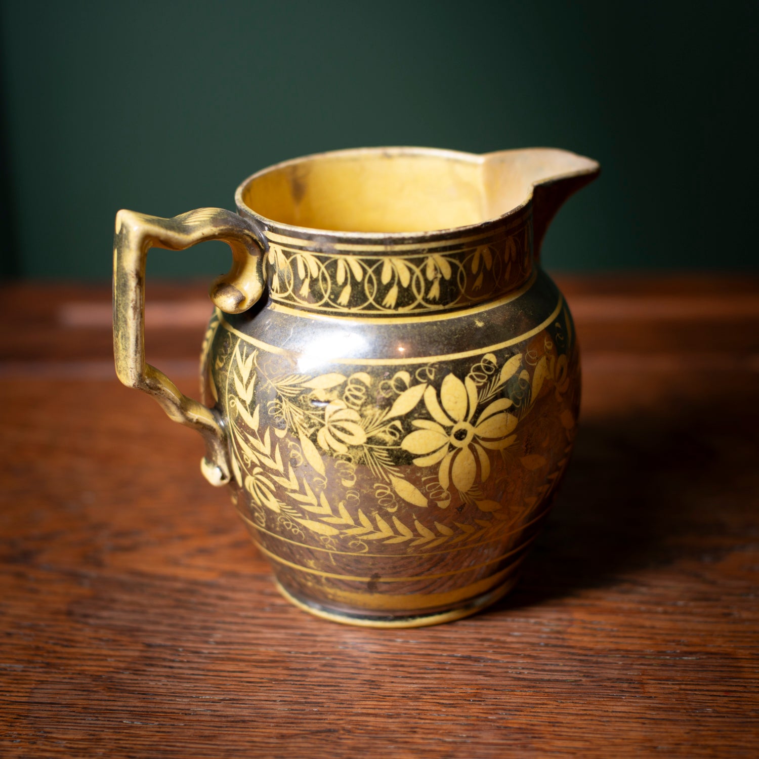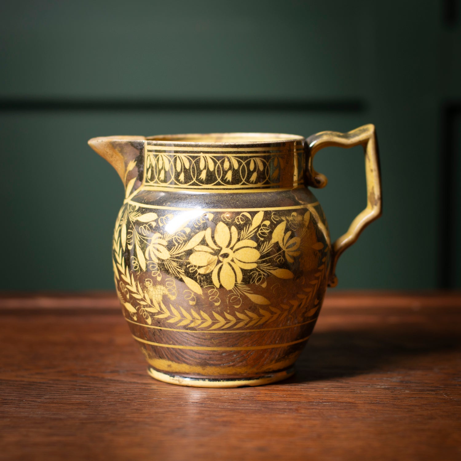 A fine example of early 19th-century silver lustreware, this small English jug dates to around 1820–1830. Decorated with a stylised floral band and foliate motifs in golden yellow enamel over a dark metallic ground, it captures the richness and detail of the period in a compact form.