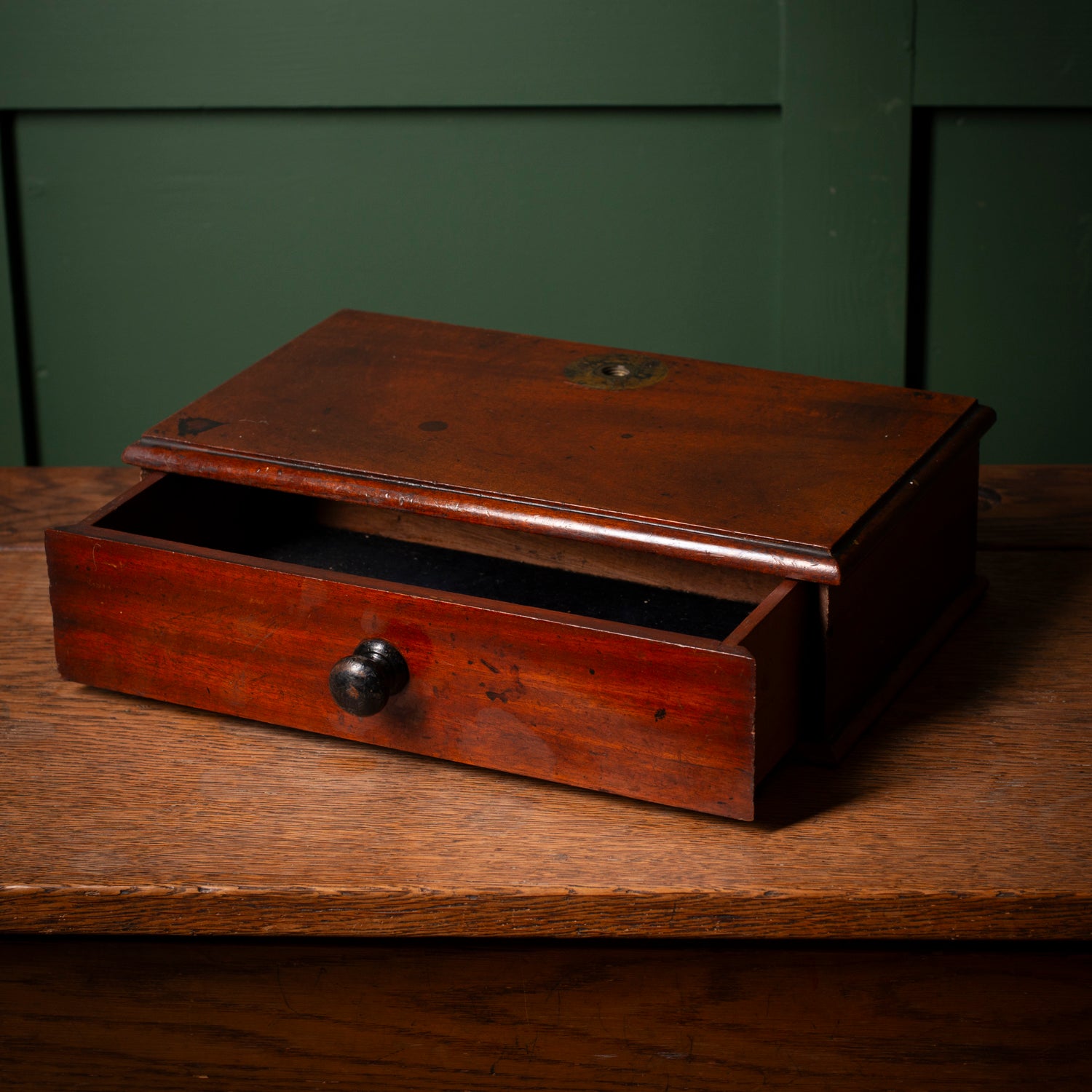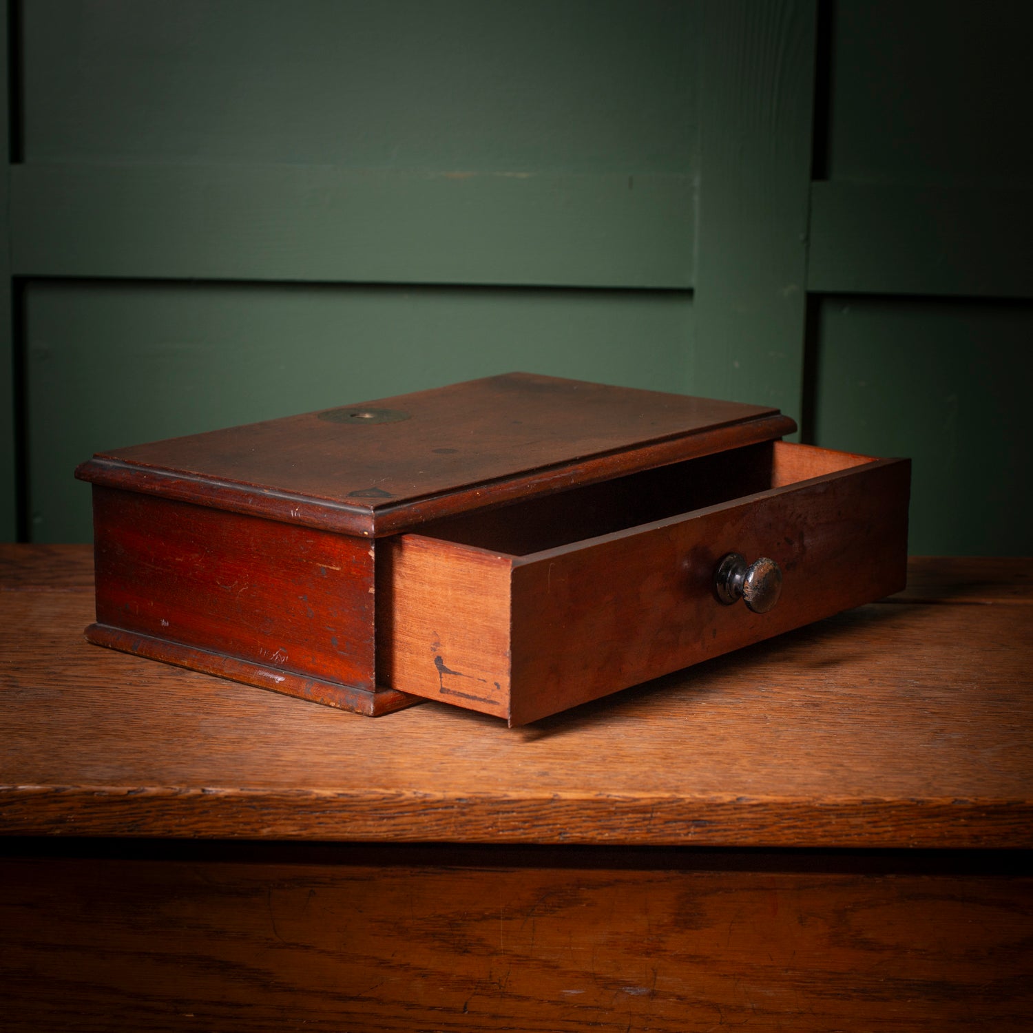 Once the sturdy base for a set of precision scales, this handsome single-drawer box has quietly outlived its original role—now offering charm, history, and utility in equal measure.