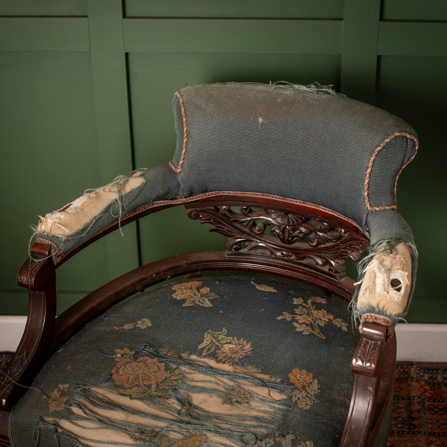 Victorian charm with a bit of work needed – this 19th-century tub chair has beautifully carved show wood and solid bones. The frame is sturdy and the castors roll smoothly, but the upholstery has seen better days. A perfect candidate for restoration, whether you’re planning a full reupholster or simply want a statement piece for a creative interior project.