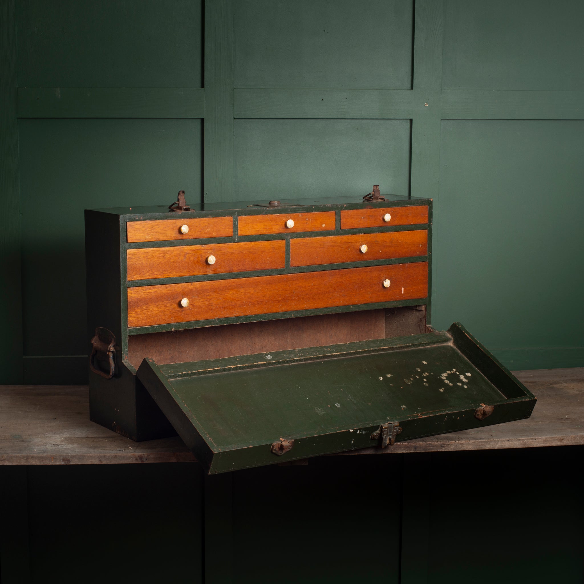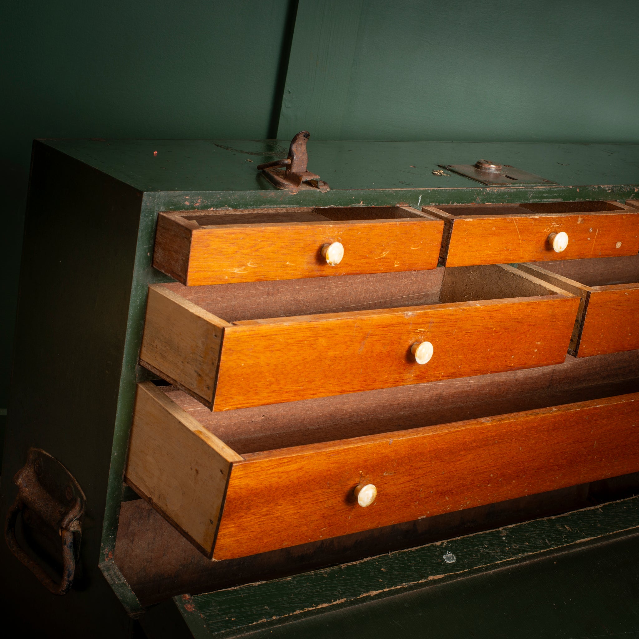 Solidly built and full of character, this large joiner’s tool chest would have once seen daily use in a busy workshop. Its robust green-painted carcass houses a practical arrangement of drawers, each faced in contrasting timber and finished with original knobs. The fold-down front provides easy access, iron side handles allow it to be moved when needed. A fine example of functional craftsmanship, ideal for use or display.